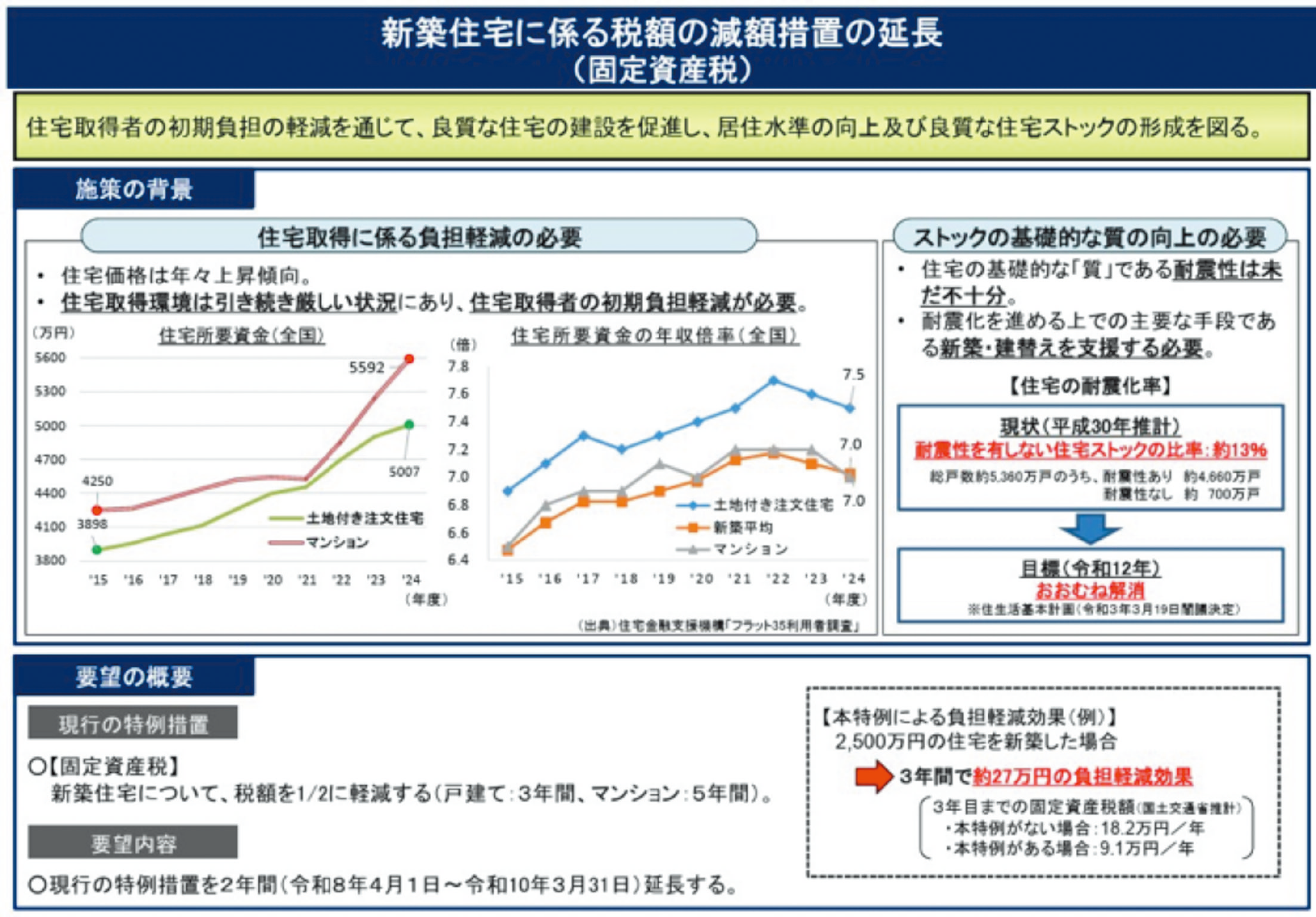 こうした状況の中で、新築住宅にかかる固定資産税の軽減措置を維持・拡充することは、購入者の経済的負担を直接的に和らげる有効な手段です。これは単に「家を買いやすくする」だけでなく、安全性や品質の高い住宅の普及を後押しする政策的な意味合いも持っています。