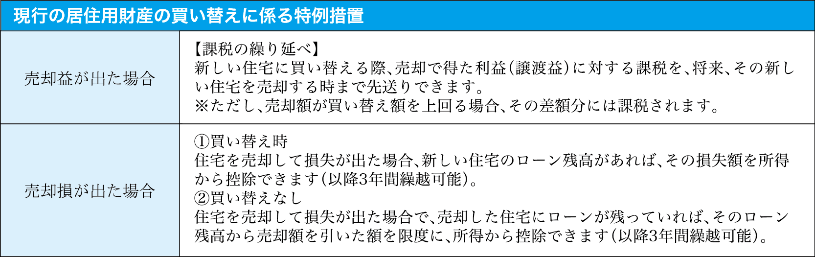 こうした課題に対し、現在、特定のマイホーム(居住用財産)を、令和7年12月31日までに売って、代わりのマイホームに買い換えたときは、一定の要件のもと、譲渡益に対する課税を将来に繰り延べることができます(譲渡益が非課税となるわけではありません)。