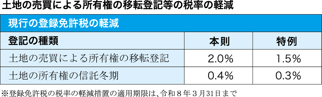 そのため政府は、「住宅用家屋の所有権の保存登記等の税率の軽減」、「住宅取得資金の貸付け等に係る抵当権の設定登記の税率の軽減」の登録免許税の税率軽減措置について令和9年3月31日まで延長しています。なお、土地の売買による所有権の移転登記等の税率の軽減措置の適用期限は、令和8年3月31日までとなっています。