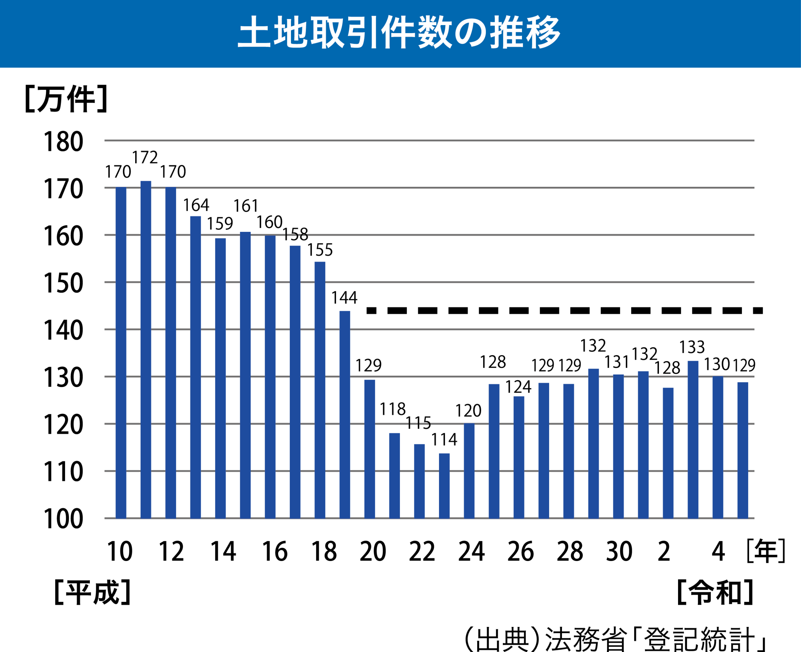 現在、日本の土地取引はリーマンショック以降、低い水準のまま横ばいが続いています。一方で、地価は上昇傾向にあり、それに伴い登録免許税の負担も増加しています。この税負担が、土地の売買をためらわせる要因となり、取引の停滞を招いている傾向にあります。