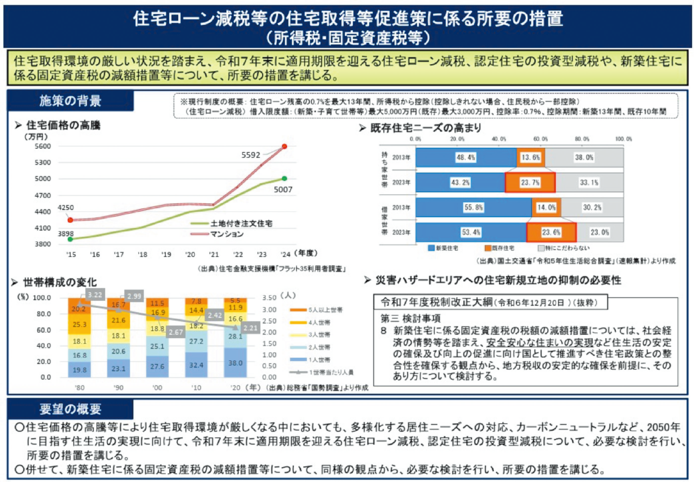 要望によると、「世帯構成」「既存住宅ニーズ」「災害ハザードエリア」の記載があるため、2026年の住宅ローン減税は、これまでと異なる新しい制度になると予想されます。