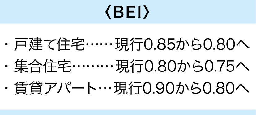 2027年度から住宅トップランナー制度における一次エネルギー消費量の基準が次のように引き上げられます。BEI(建築物の省エネ性能を評価する指標)は設計一次エネルギー消費量を基準一次エネルギー消費量で割った値で、数値が小さいほど省エネ性能が高いことを示します。