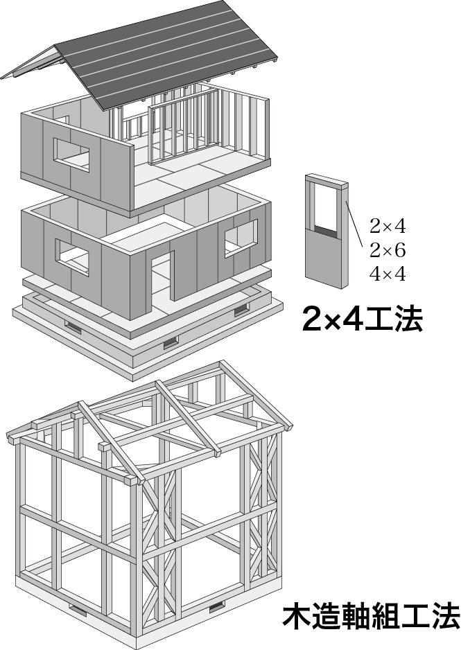 柱、梁、筋かいなどの組み合わせで構成する「軸組工法(在来工法)」と「壁式工法」がある。「壁式工法」には2インチ×4インチ(ツーバイフォー)などの規格材を組んだ枠組みに構造用合板を打ち付けて造った床面、壁面などのパネル壁で荷重を支える「枠組壁工法」(ほかにも2×6、4×4もある)や、強化パネルによる「木質パネル工法」がある。