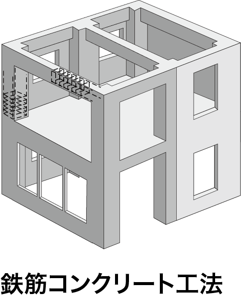 鉄筋の入った床(スラブ)や壁で造る「壁式工法」、同じく柱と梁で造る「ラーメン構造」、コンクリートパネルで造る「プレキャストコンクリート(PC)工法」などが代表的。コンクリートブロックに鉄筋を入れて補強して壁面を造る「補強コンクリートブロック造」もある。