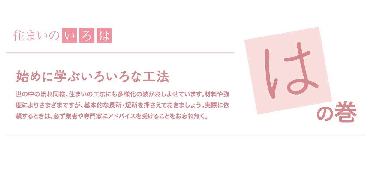 世の中の流れ同様、住まいの工法にも多様化の波がおしよせています。材料や強度によりさまざまですが、基本的な長所・短所を押さえておきましょう。実際に依頼するときは、必ず業者や専門家にアドバイスを受けることをお忘れ無く。
