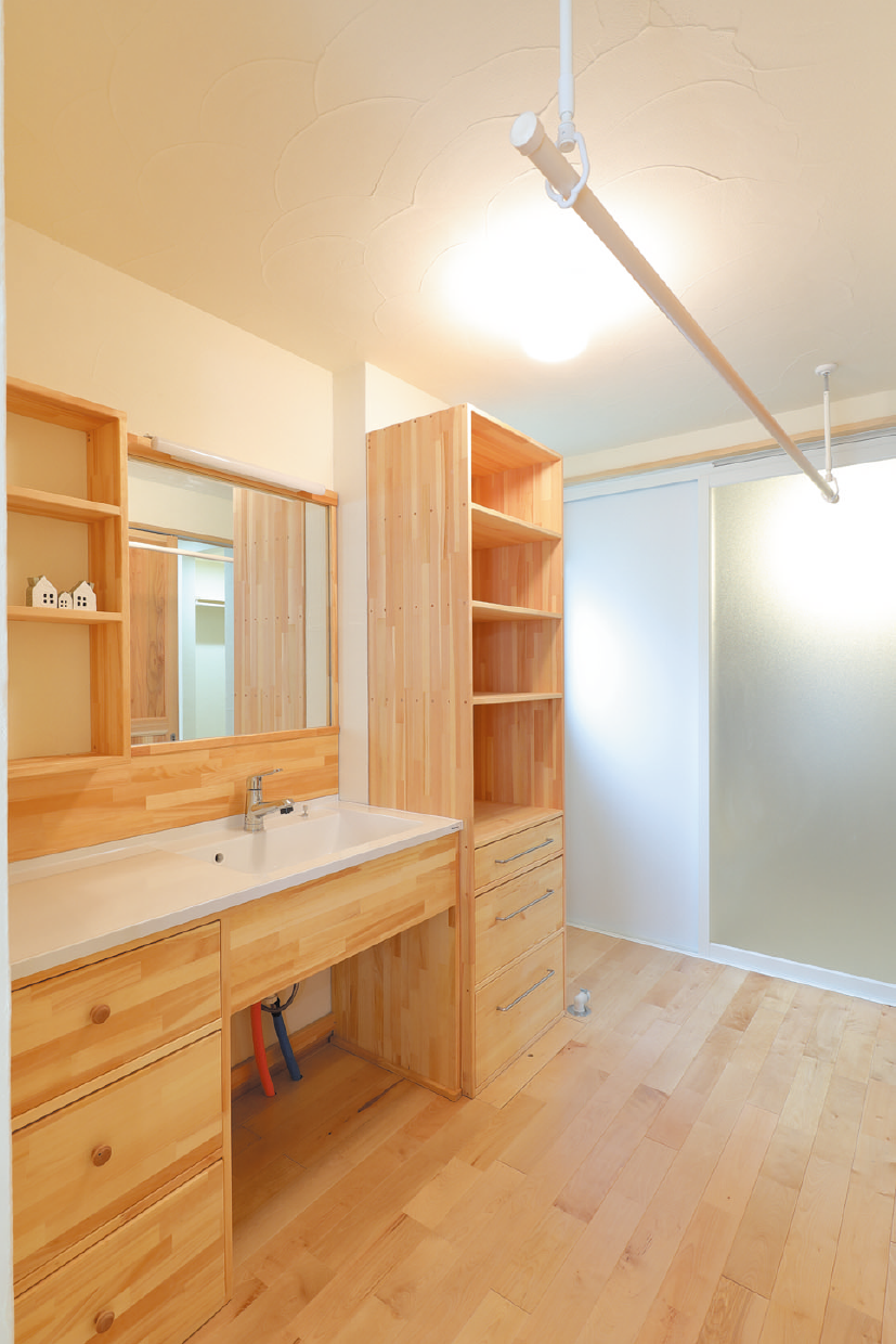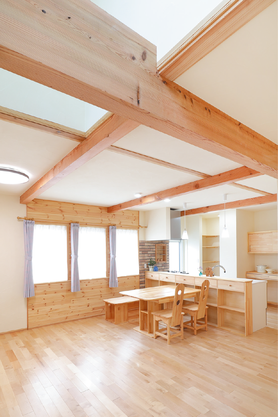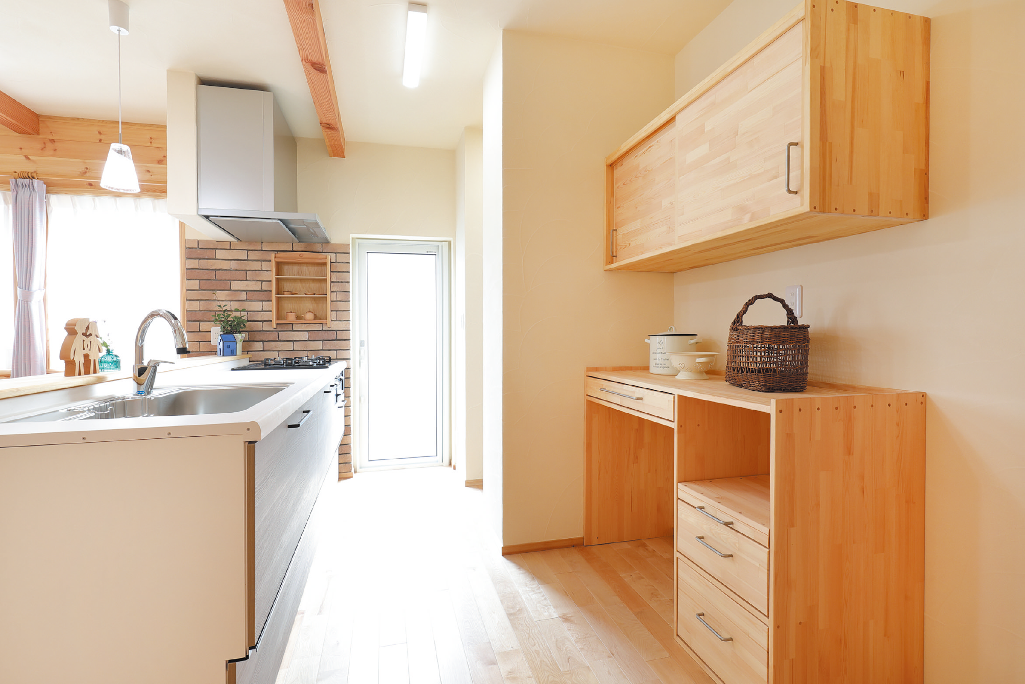 U様の希望をもとに完成したお住まいは、玄関→LDK→洗面室→お風呂と繋がる回遊動線を採用。LDKに家族とのつながりを感じられる開放感のある吹抜け、玄関土間やパントリー、手造り家具などの収納も充実。暮らしやすさとデザイン性を両立させたお住まいとなりました。