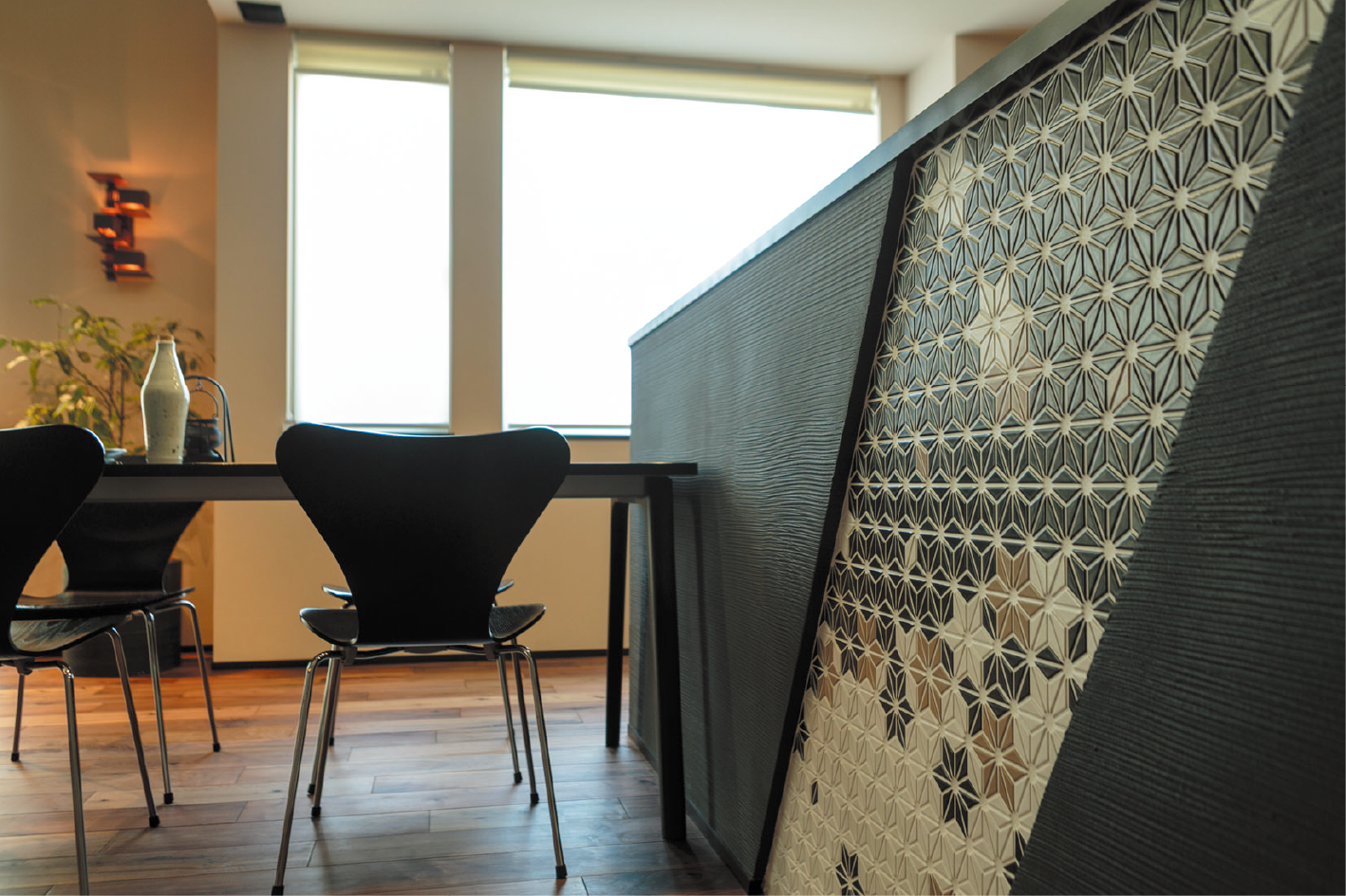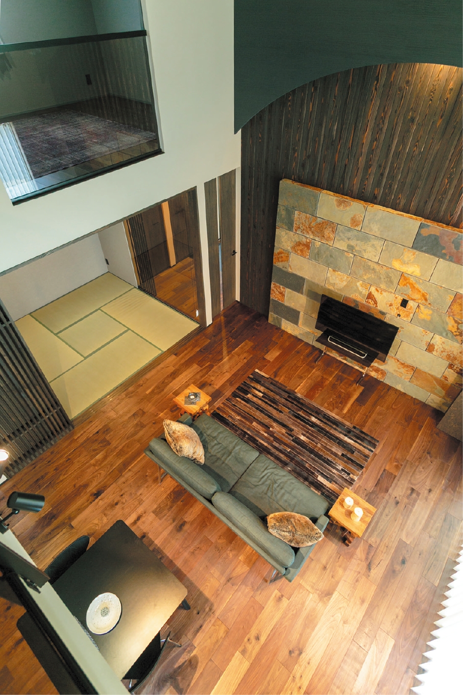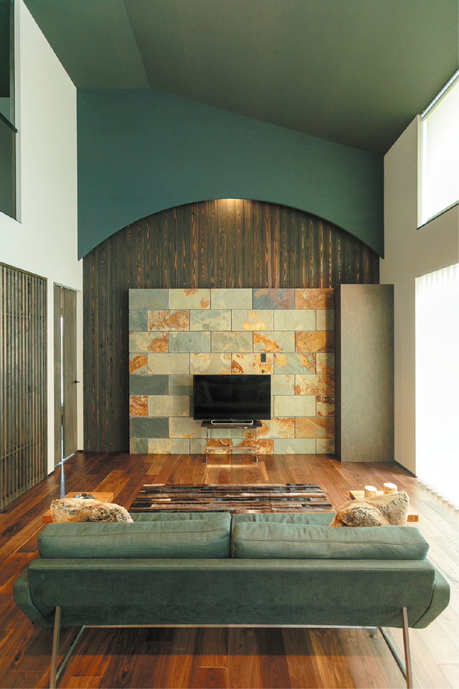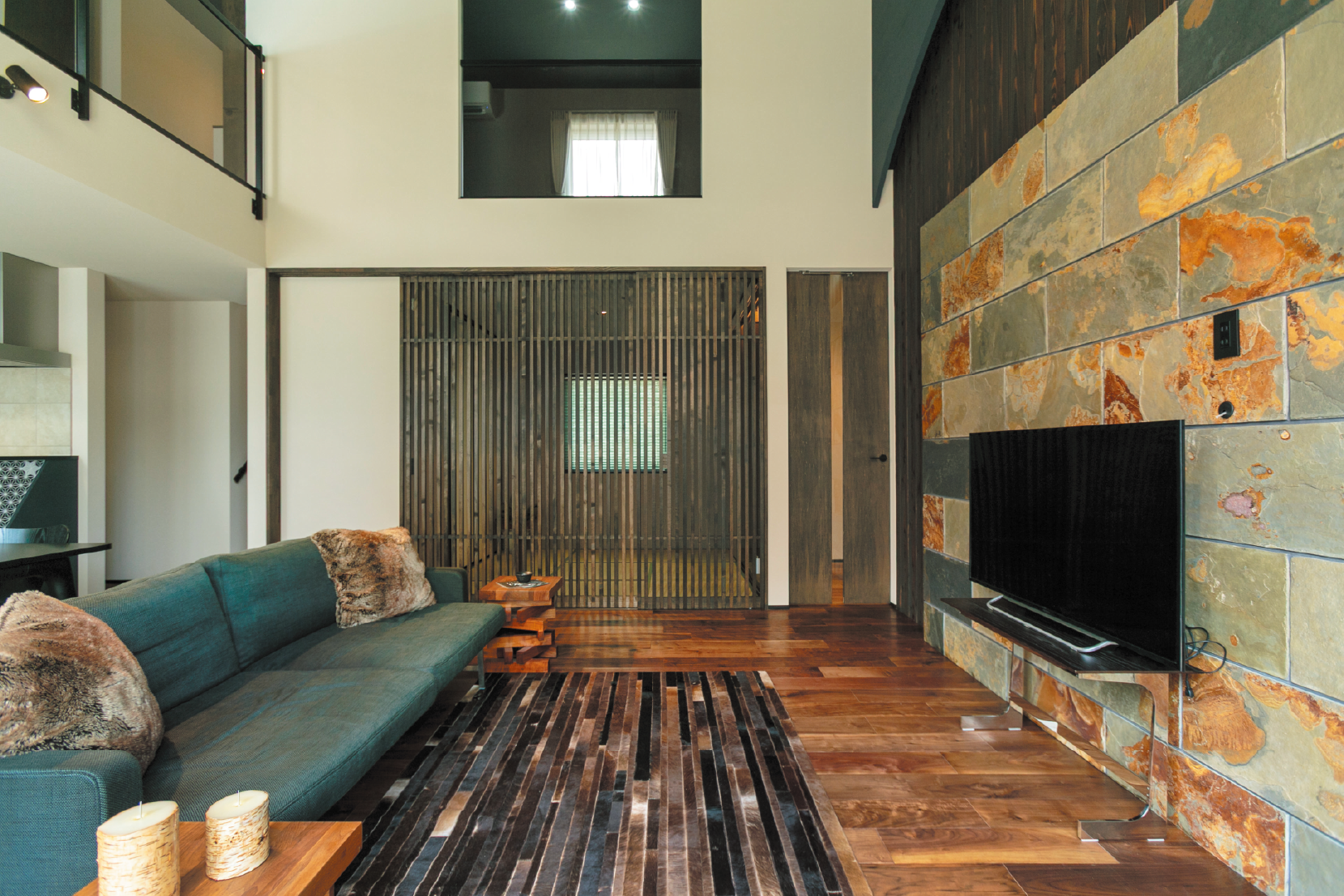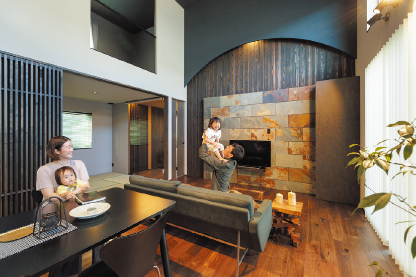 リビングは茶系の落ち着いたトーンで統一され、アールの曲線が優しい印象を与えています。テレビ背面には、色と質感が空間に豊かな表情を添えるストレートブラックマロンの天然石を採用。焼き杉の壁材は浮造り仕上げで、その裏に配した照明が柔らかな光を放ち、深みのある陰影を演出しています。15センチの幅広無垢のブラックウォールナットを使用し、木目の美しさが際立つ仕上がりに。キッチンカウンターの前面に施されたモザイクタイルも、色味や配置を細かく調整し、ダイニングテーブルとの位置関係まで考慮された、美しいバランスが魅力です。