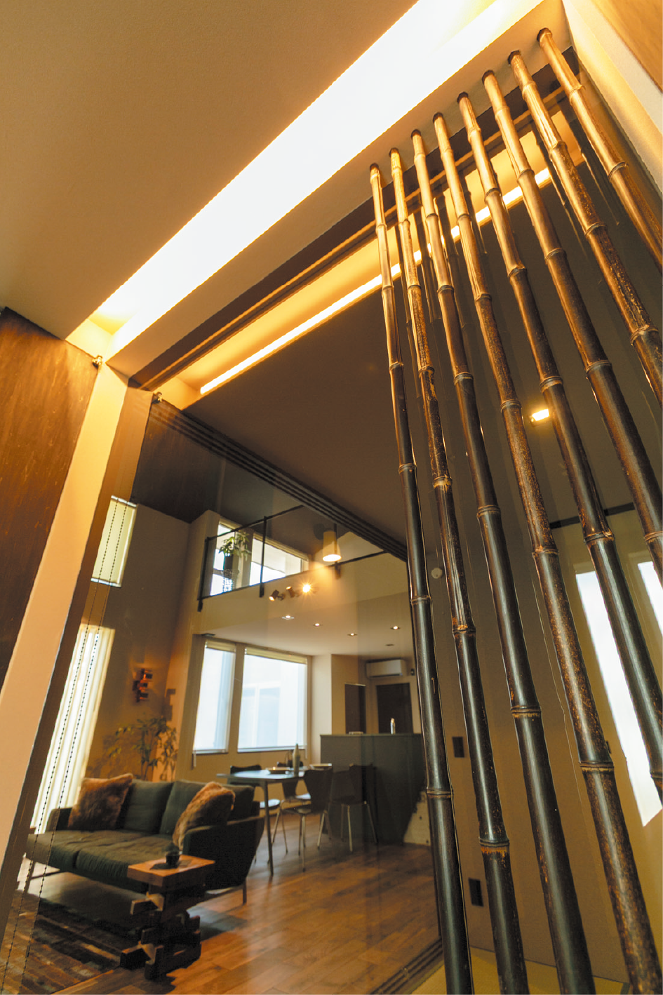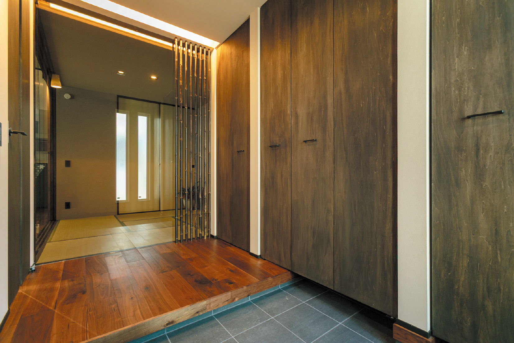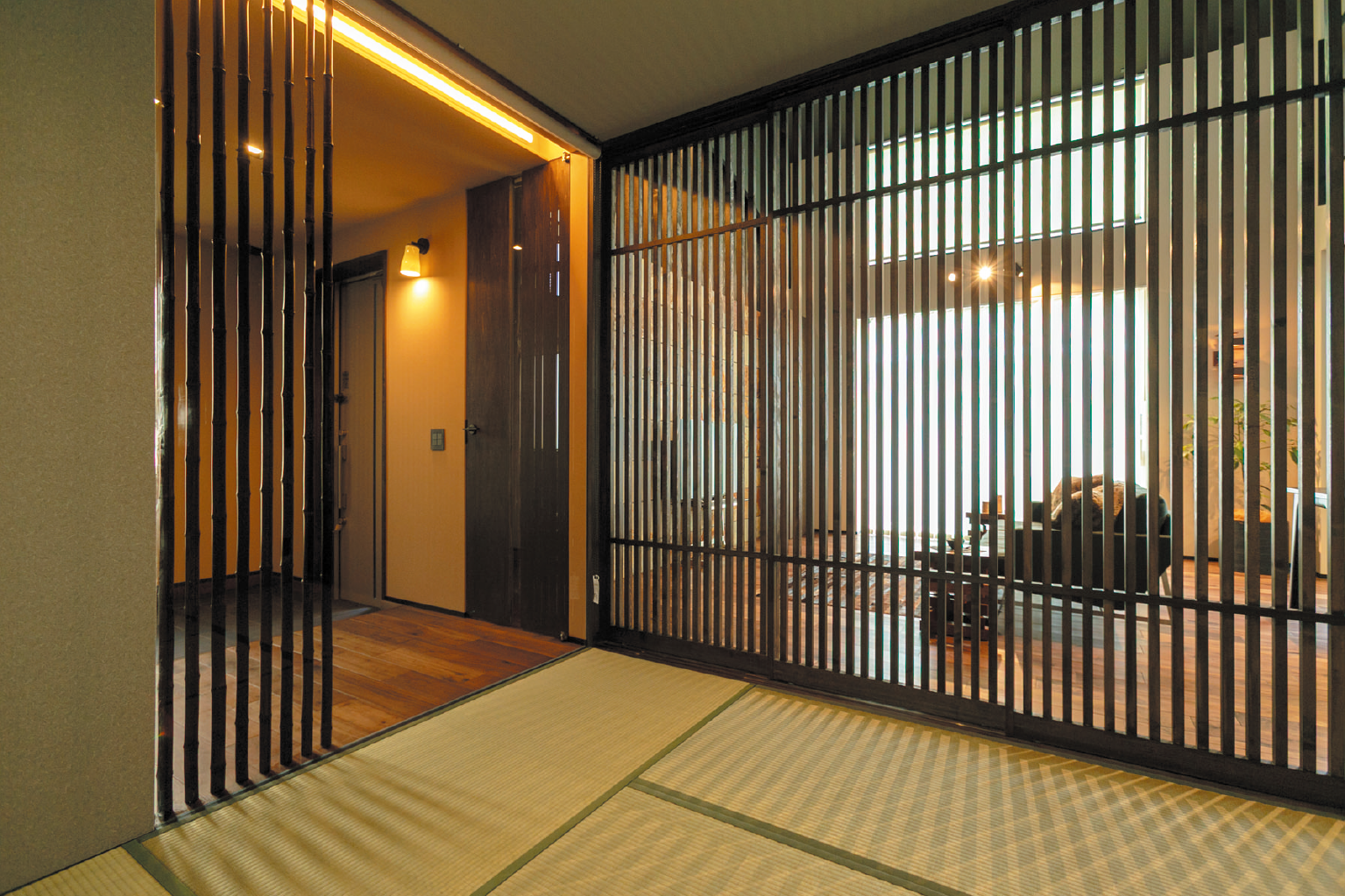 玄関正面には、黒竹の格子とブロンズガラスを組み合わせ、奥行きを感じさせる和室を配置。職人技が光る竹の格子は、美しさだけでなくメンテナンス性にも配慮された仕上がりです。