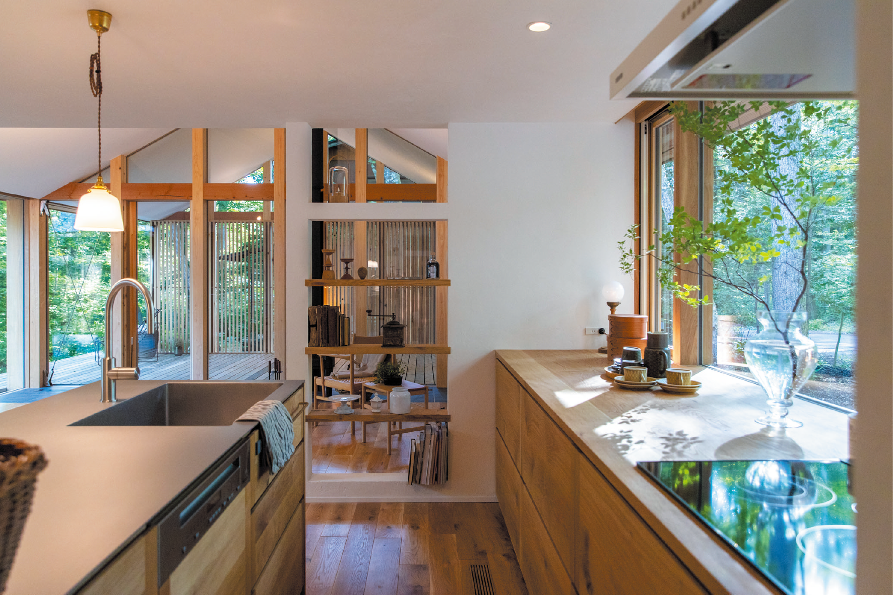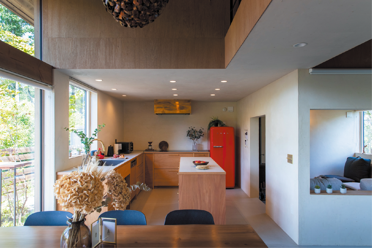 無垢材を丁寧に削るところから始まり、自然のゆらぎを感じる曲がり木や、炭・藁・岩・土といった素材を取り入れながら、時を重ねるほどに美しさが深まる──そんな「経年美化」を味わえる住まいです。