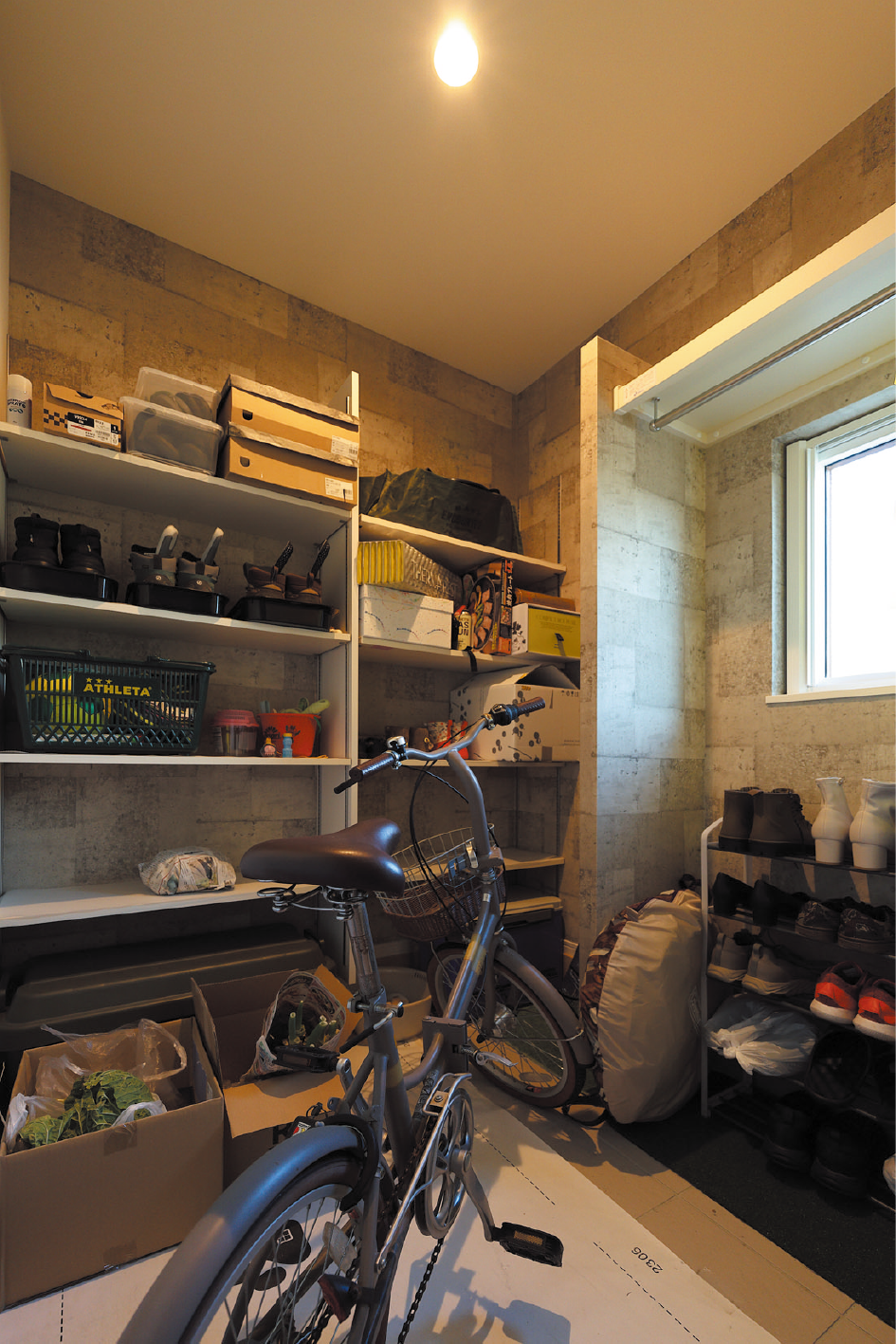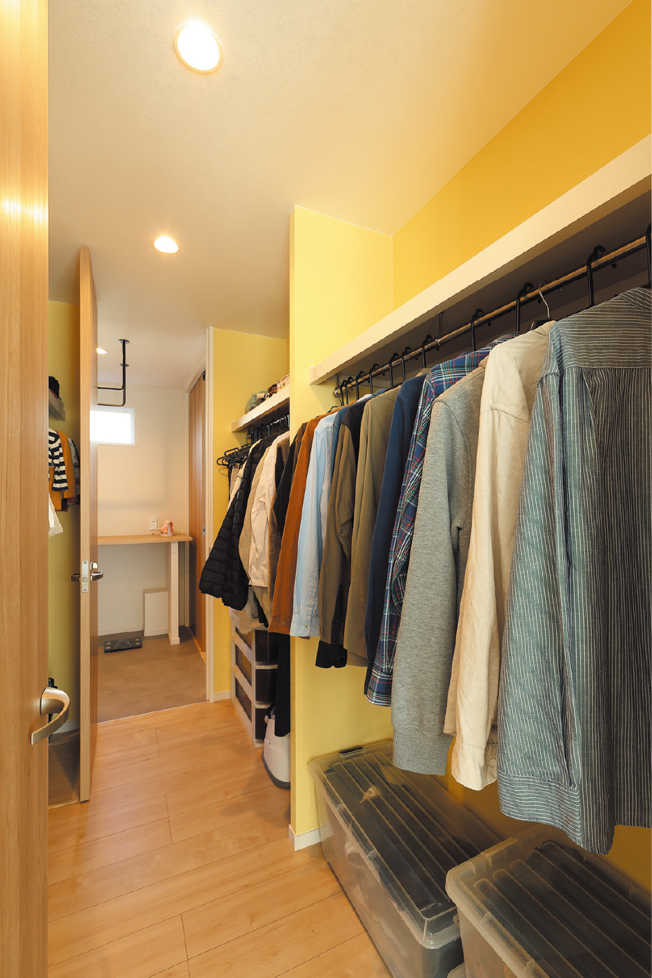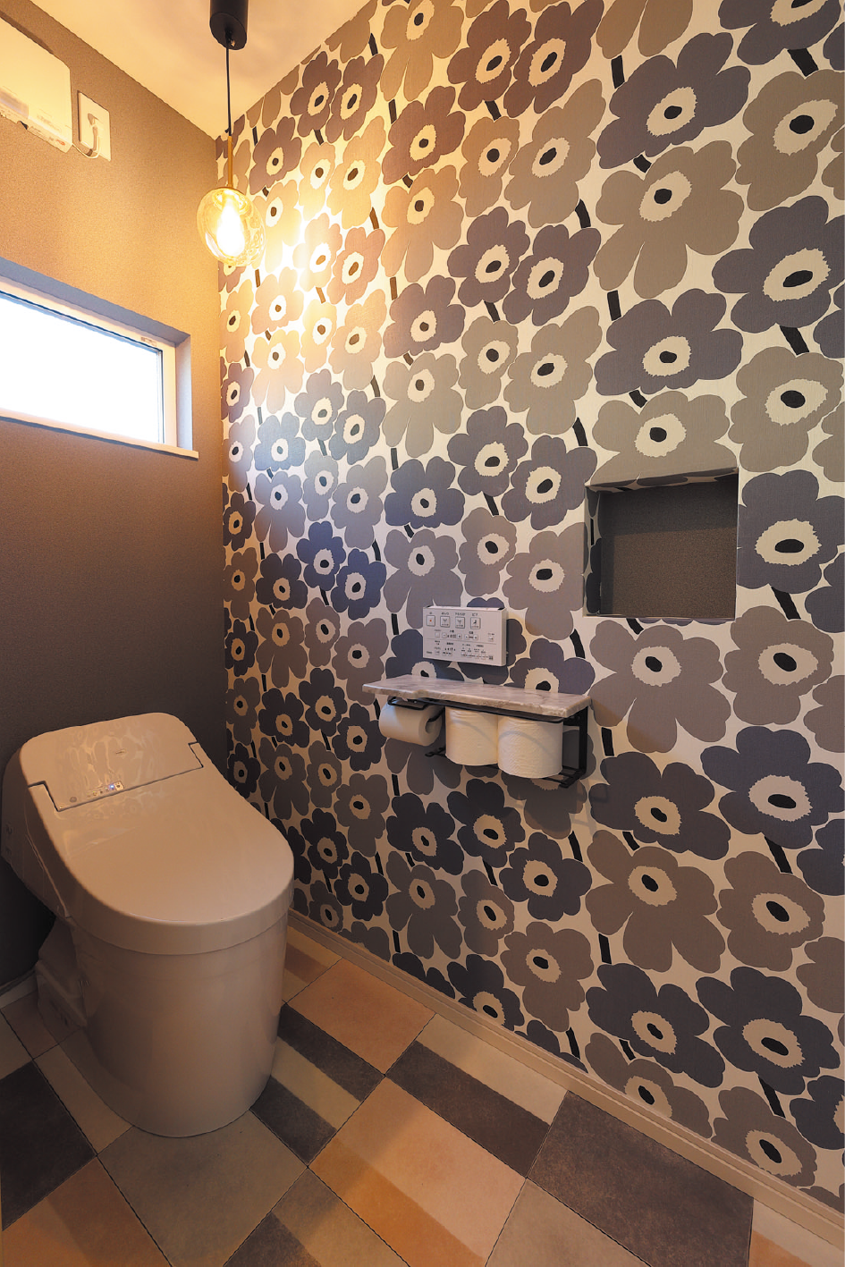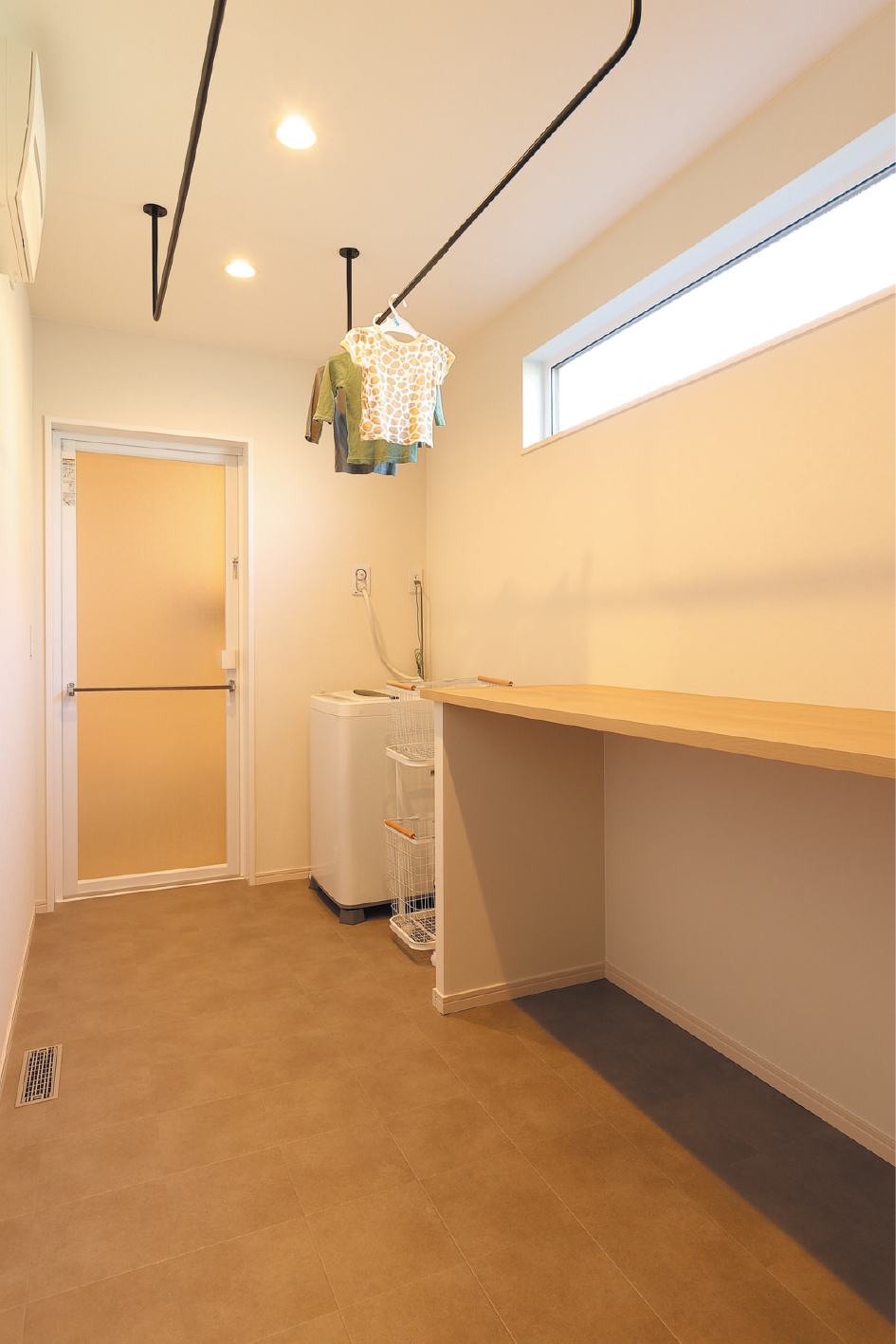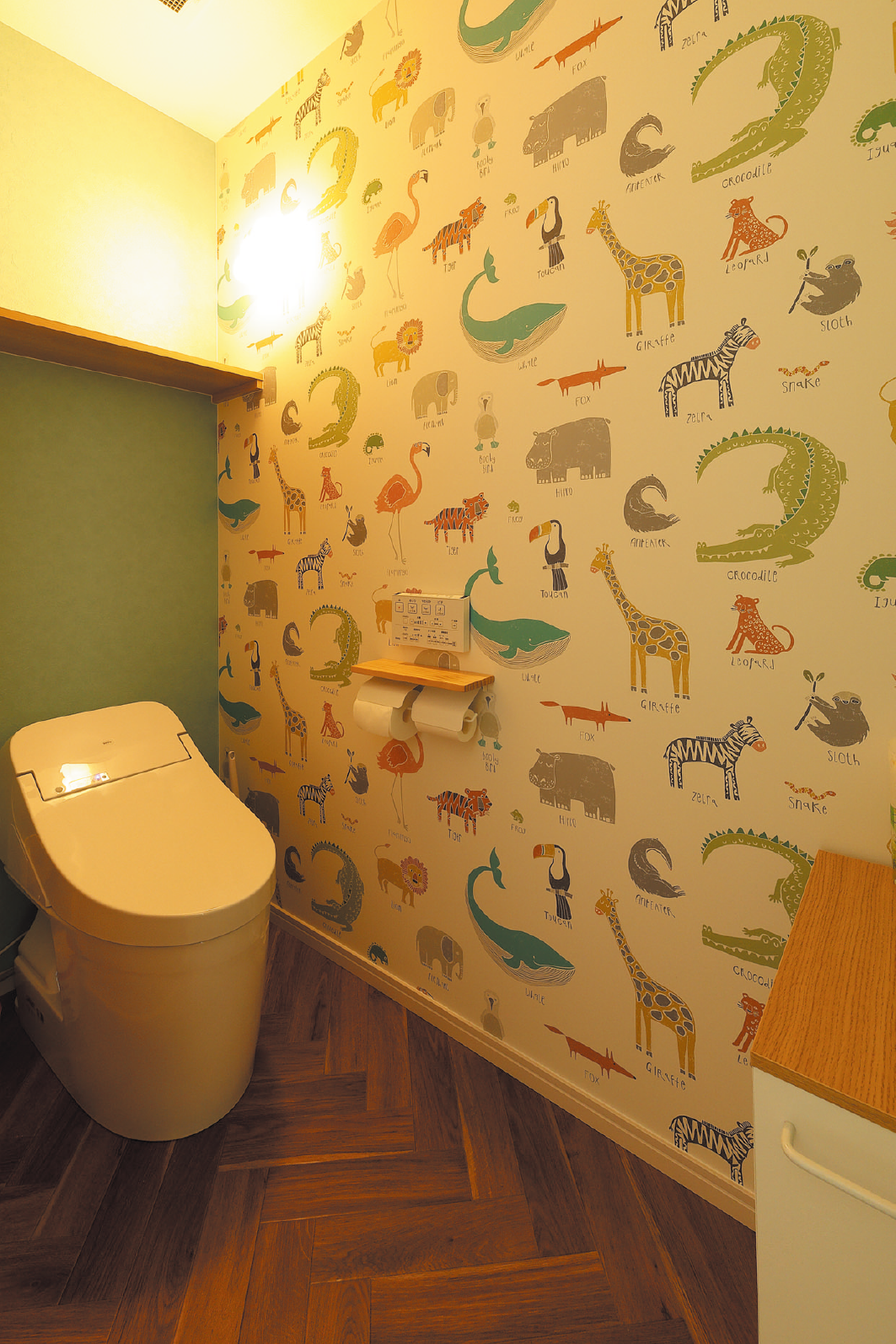 家族が集まる空間には開放感を持たせ、畳コーナーと続きになった25帖もの広々リビング。玄関~洗面~ファミリークローゼットへと繋がる無駄のない帰宅動線も大きなポイントです。土間やパントリー、ホールなど必要な場所に収納を備え、日々の暮らしやすさも実現。広さを確保したランドリースペースのおかげで家事効率も大幅にアップ。トイレは渋滞を避けるために2カ所に設け、それぞれ遊び心のあるアクセントクロスを取り入れ、さりげなく個性を演出しています。