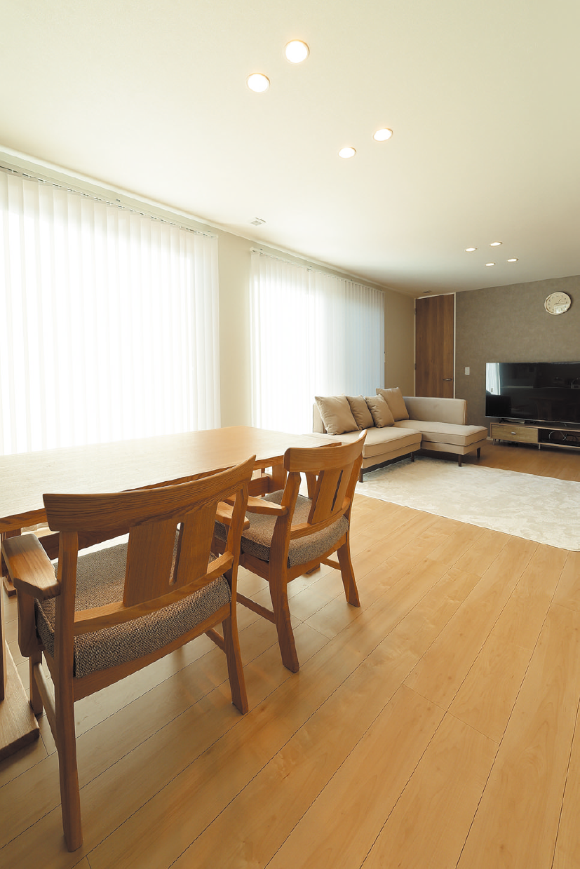 岩手の厳しい冬に対応できるよう、断熱性・気密性に配慮し、サッシにはトリプルガラスを採用。寒さを感じることなく快適に過ごせる工夫が施されています。