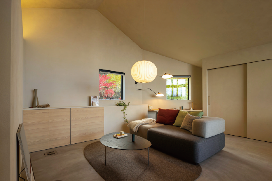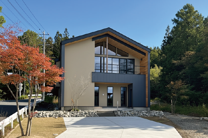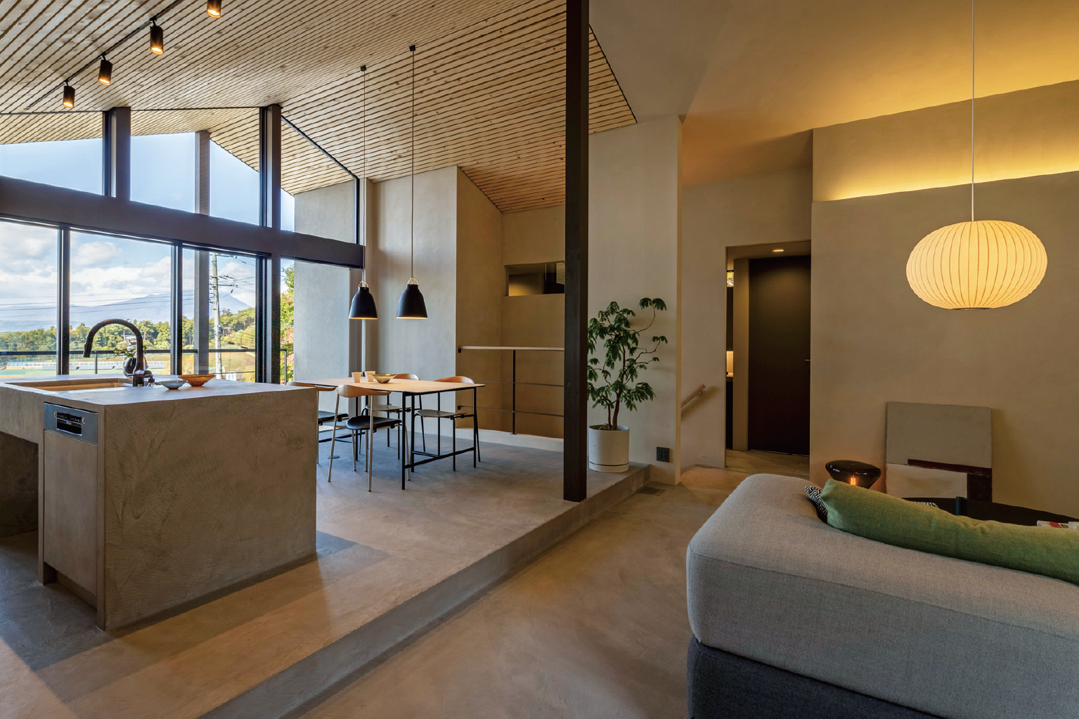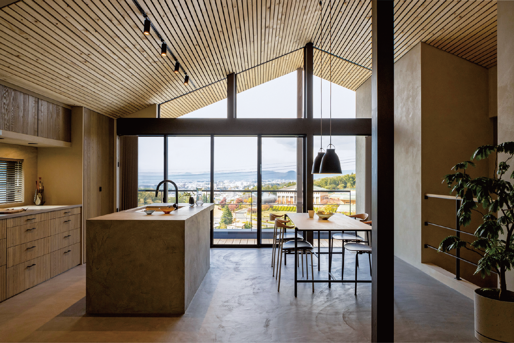 岩山の自然豊かな風景に溶け込みながらも確かな存在感を放つ外観。この住まい最大の魅力は大開口窓から四季折々の美しい山並みや街並みが広がり、贅沢な眺めを堪能できる2階リビングです。