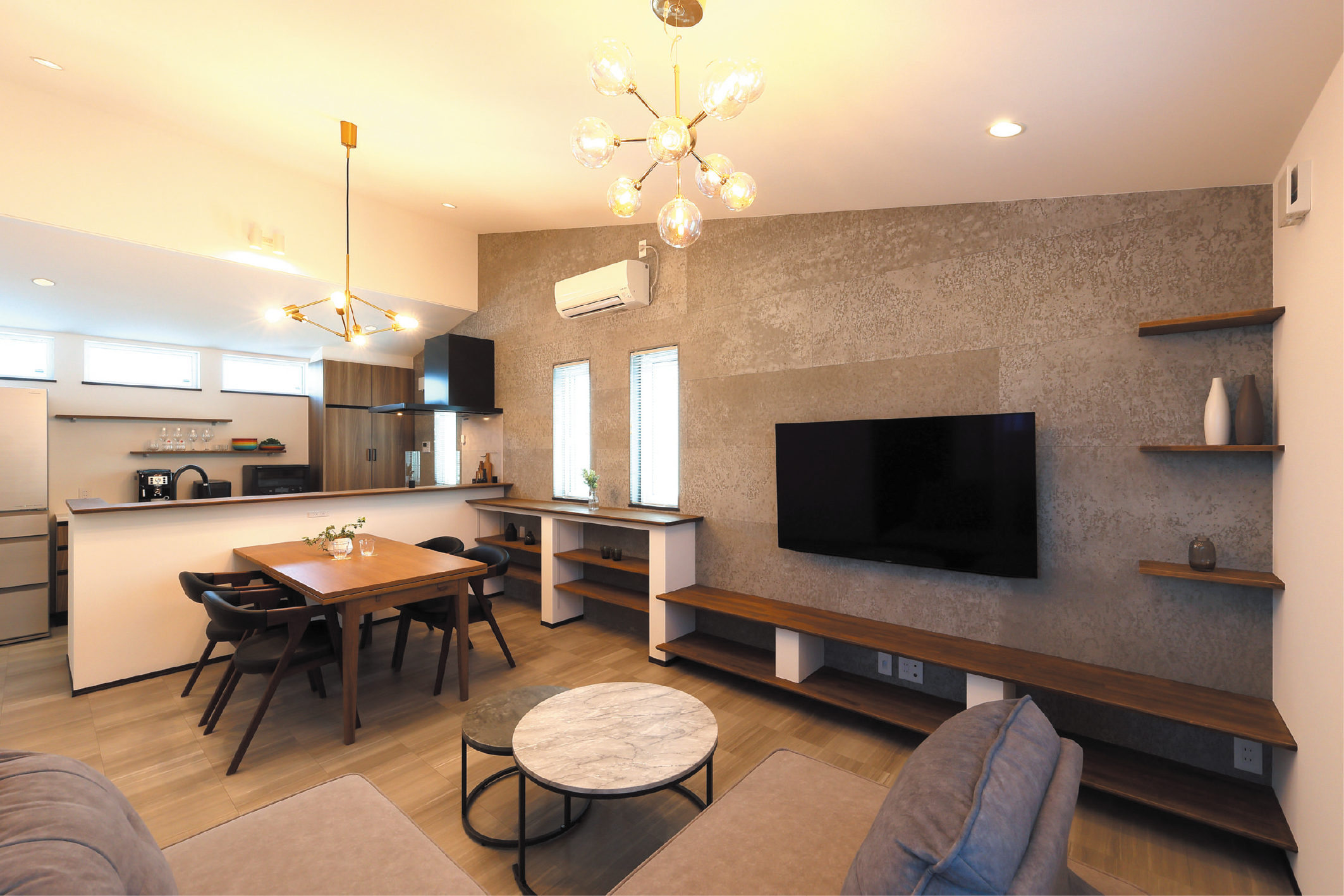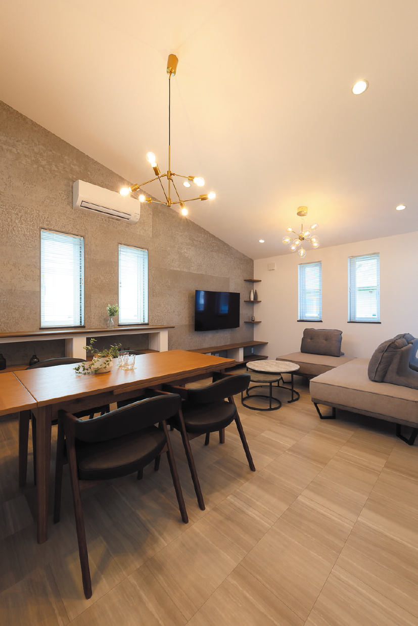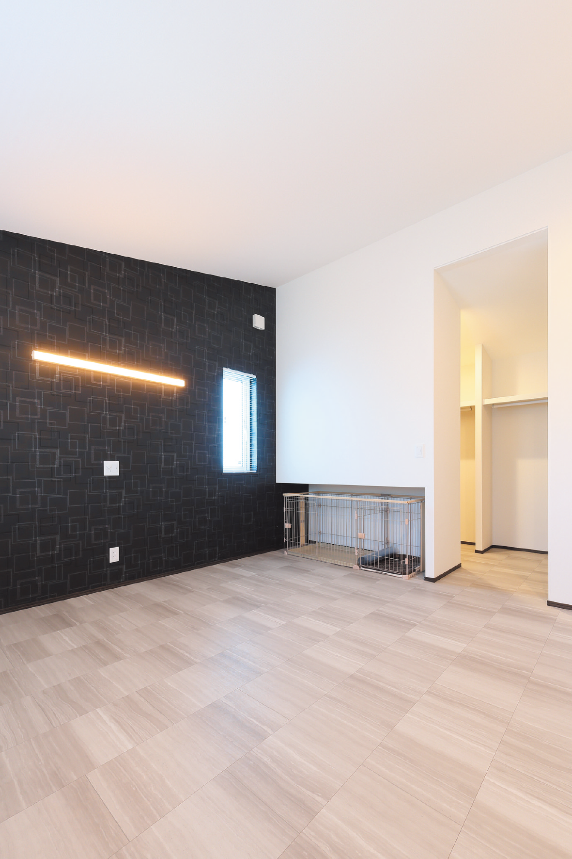 敷地が限られる中で駐車場を十分確保し、家族が集うリビングを中心に設計。外観はグレーの落ち着いた佇まい。1階に子ども部屋と水回り、2階にLDKと寝室を配置し、斜め天井で開放感を演出しました。室内は白を基調に、LDKの壁には表情豊かなボード・SOLIDO(ソリド)を採用。キッチンは家族の顔が見えるように配置され、寝室には愛犬のケージが収まる工夫も。収納や造作棚も充実し、洗濯動線も1か所で完結。太陽光発電とエコキュートをHEMSで連携し、余剰電力を活用して電気代を抑えながら消費を最適化した、安心と快適を叶える未来志向の住まいです。