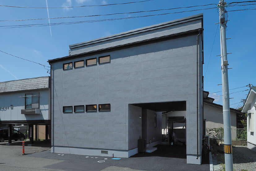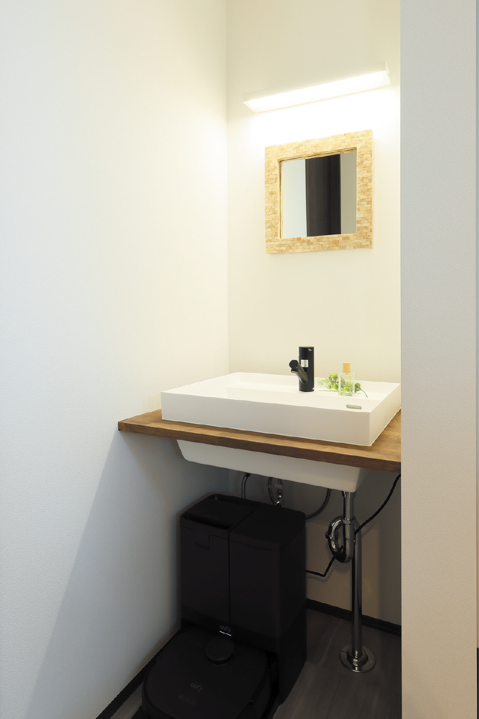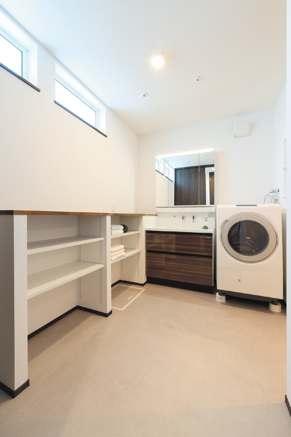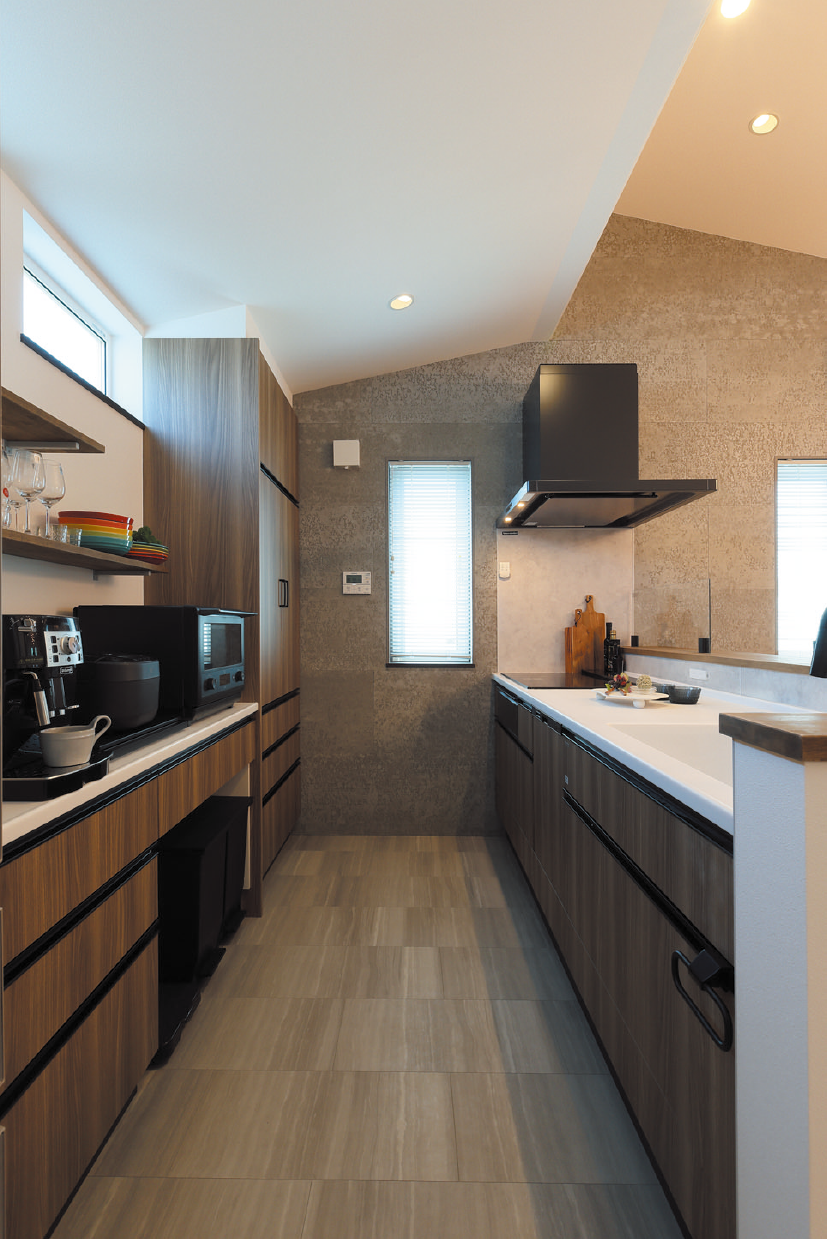 敷地が限られる中で駐車場を十分確保し、家族が集うリビングを中心に設計。外観はグレーの落ち着いた佇まい。1階に子ども部屋と水回り、2階にLDKと寝室を配置し、斜め天井で開放感を演出しました。室内は白を基調に、LDKの壁には表情豊かなボード・SOLIDO(ソリド)を採用。キッチンは家族の顔が見えるように配置され、寝室には愛犬のケージが収まる工夫も。収納や造作棚も充実し、洗濯動線も1か所で完結。太陽光発電とエコキュートをHEMSで連携し、余剰電力を活用して電気代を抑えながら消費を最適化した、安心と快適を叶える未来志向の住まいです。