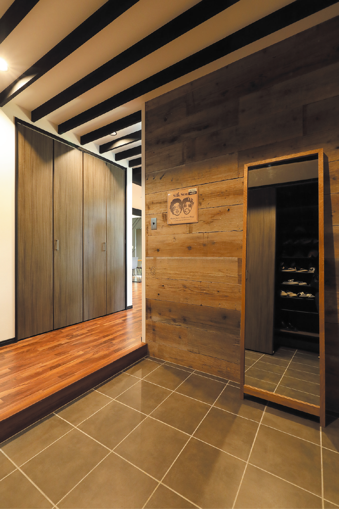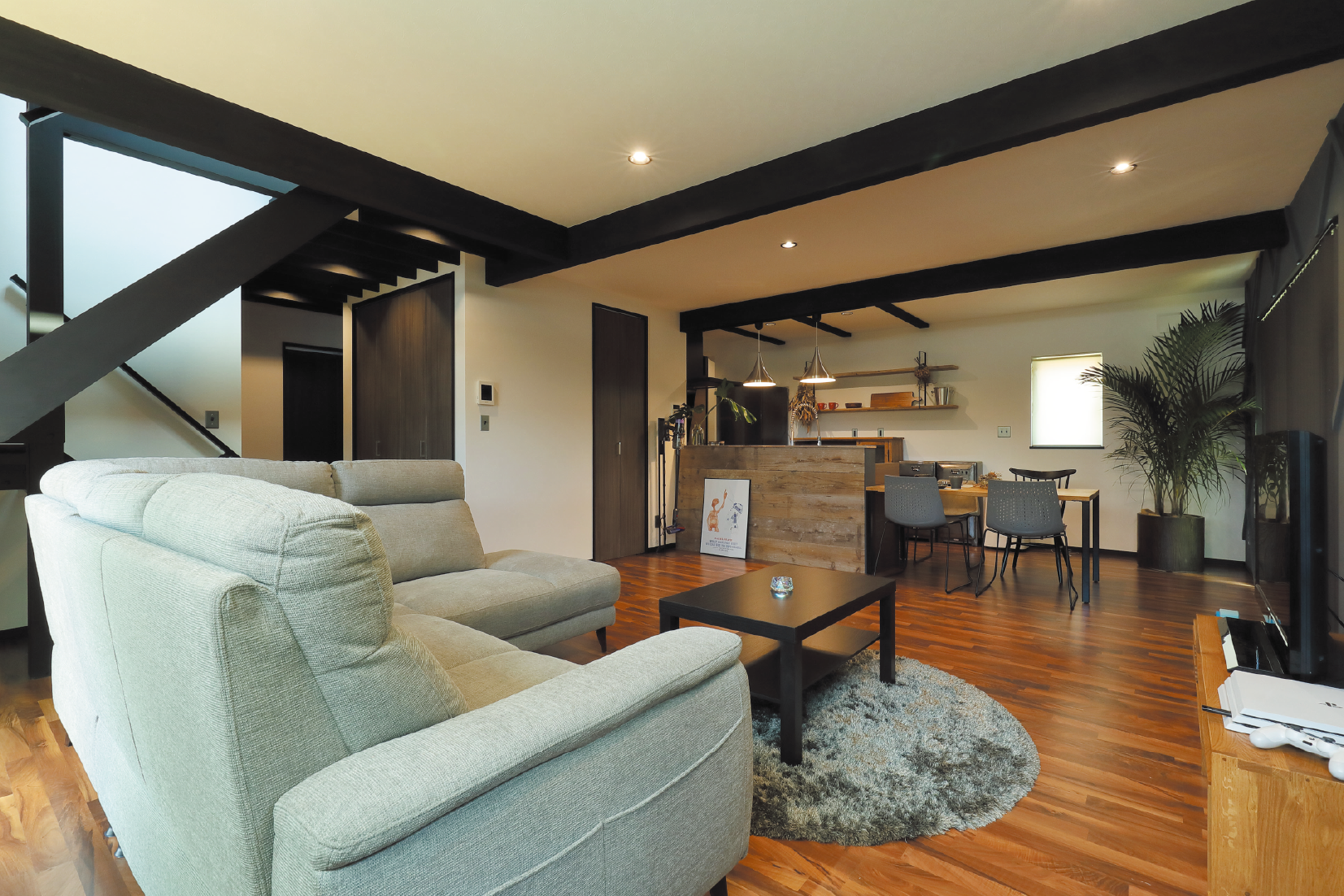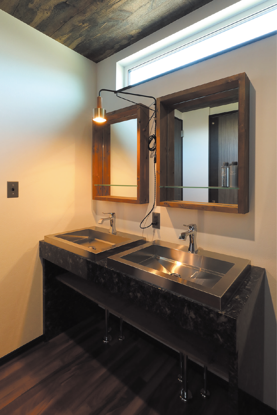 外観は黒のガルバリウム鋼板のスタイリッシュモダンな佇まい。玄関前に車3台用のワイドなカーポートも設置されています。玄関内の壁板とキッチンカウンターの化粧板には、エイジング加工を施した存在感のある色味や質感の木材を採用。キッチンの照明器具はステンレスを用いて、BARのような雰囲気を醸し出す洒落たキッチンに仕上がっています。