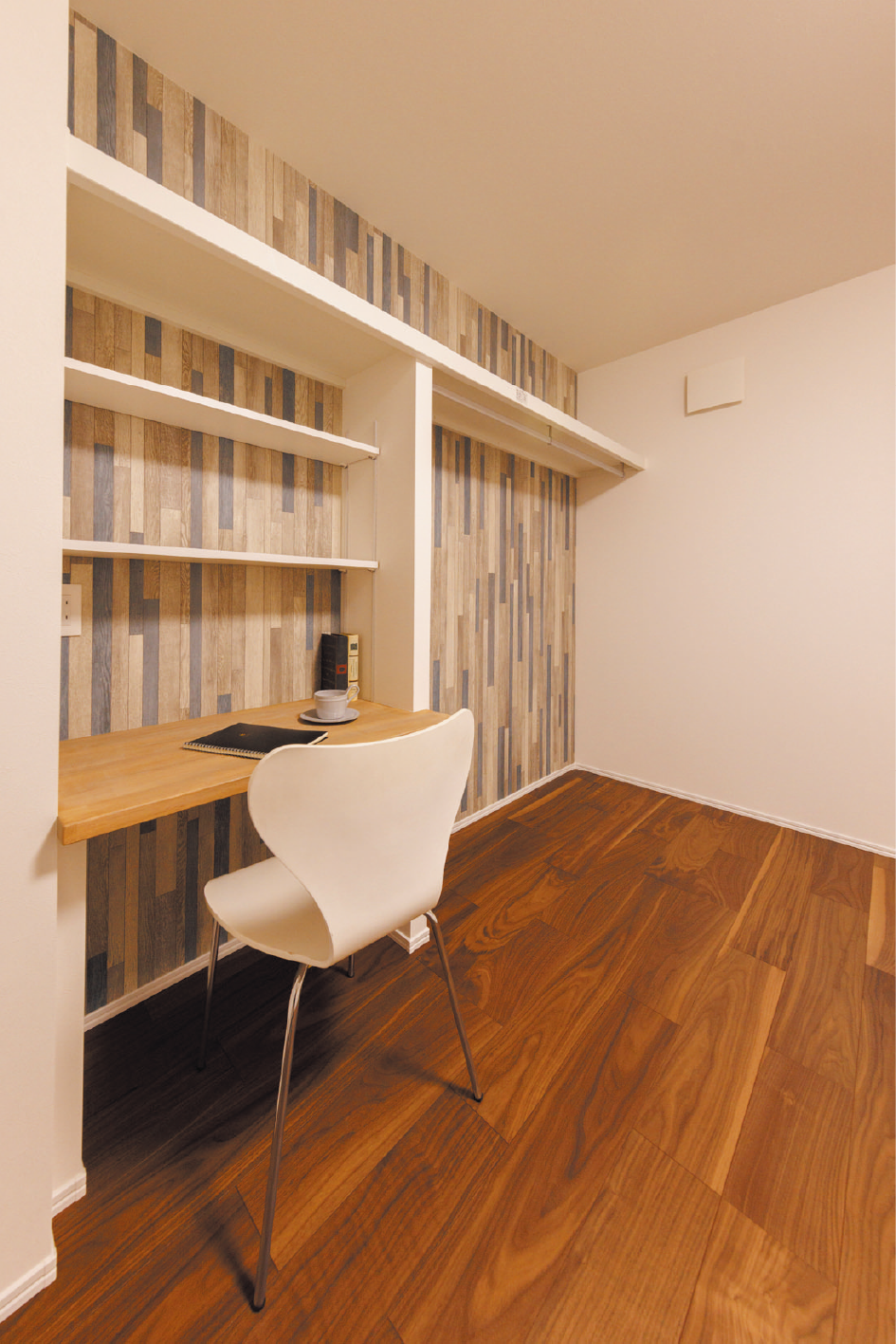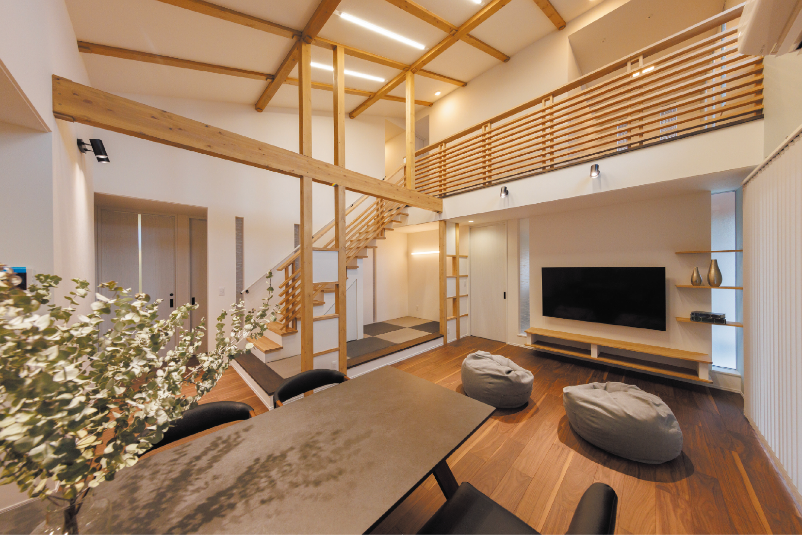 こだわったのはシンプルな心地良さ。外観は、ウッドデッキのある大きな片流れ屋根の和モダンスタイルの佇まい。間取りは、1階にLDK、小上がり畳スペース、水回り、寝室。2階には子ども部屋とフリースペースを配置しています。白×木を基調としたナチュラルモダンな住空間は、施主様の思いに寄り添いながら一つ一つ形となり、理想的な住まいに仕上がりました。