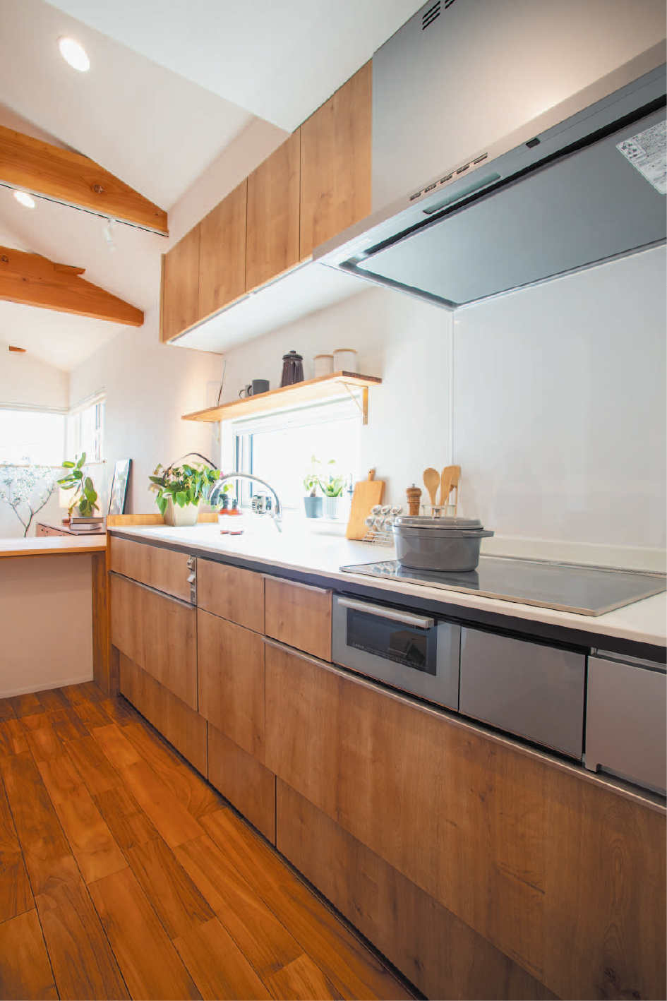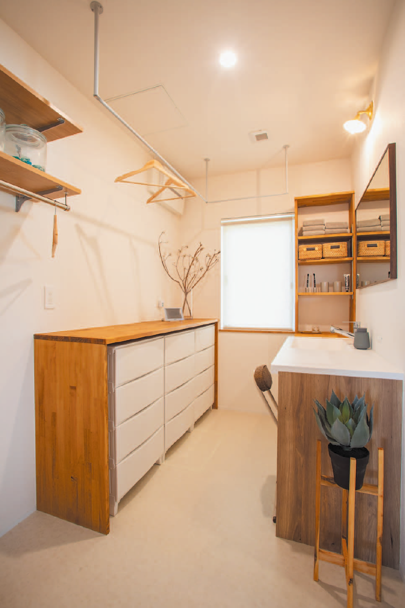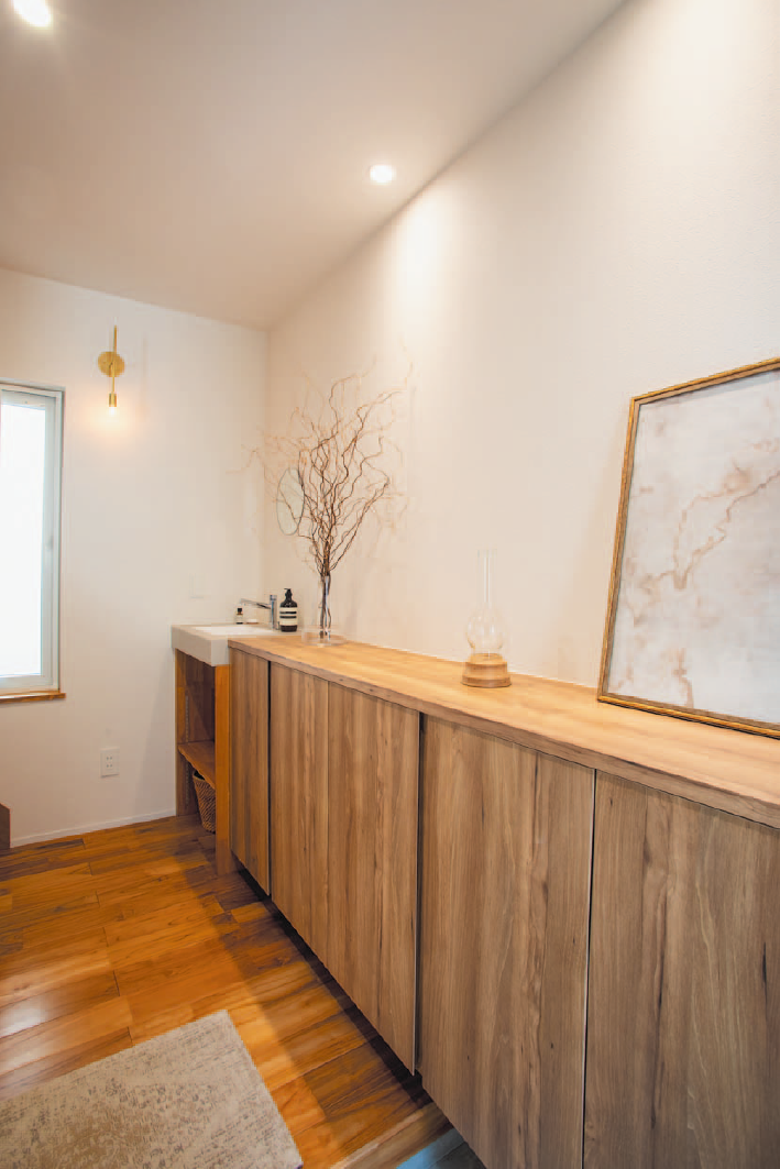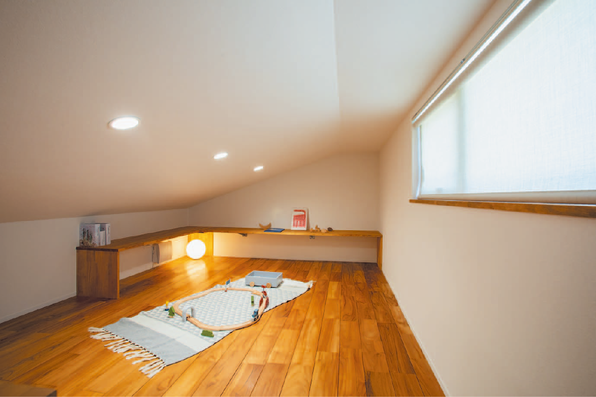 外壁は塗り壁+レッドシダーの羽目板を採用し、ナチュラルで落ち着いた雰囲気を演出しています。2階には無垢材の床や梁見せの勾配天井が心地よい開放感を与えるリビングと水回りを配置。窓の位置にも工夫を凝らし、外から家の中が見えにくいようにプライバシーを確保しながら、明るく快適な暮らしを実現しています。収納もたっぷり確保され、家族の集いを演出する造作ダイニングカウンターや家事コーナーを設けた洗面所、家事動線の良い間取りもポイントです。1階には可変性のある間取りの子ども部屋と寝室を配置。「帰ったらすぐに手を洗いたい」という声に応えて、玄関ホールに“お帰り手洗い”も設置。車を3台置ける駐車場、小屋裏収納、ビルトインガレージの上に広々バルコニーも設けています。