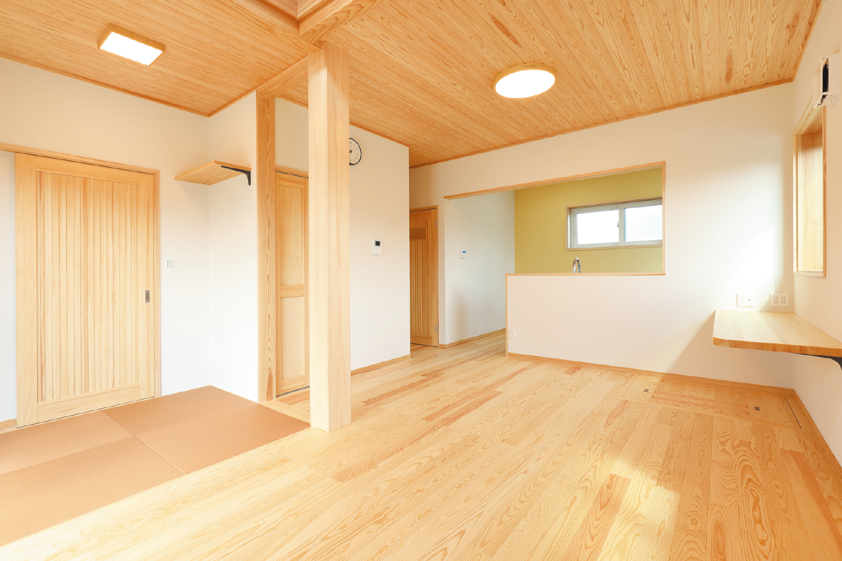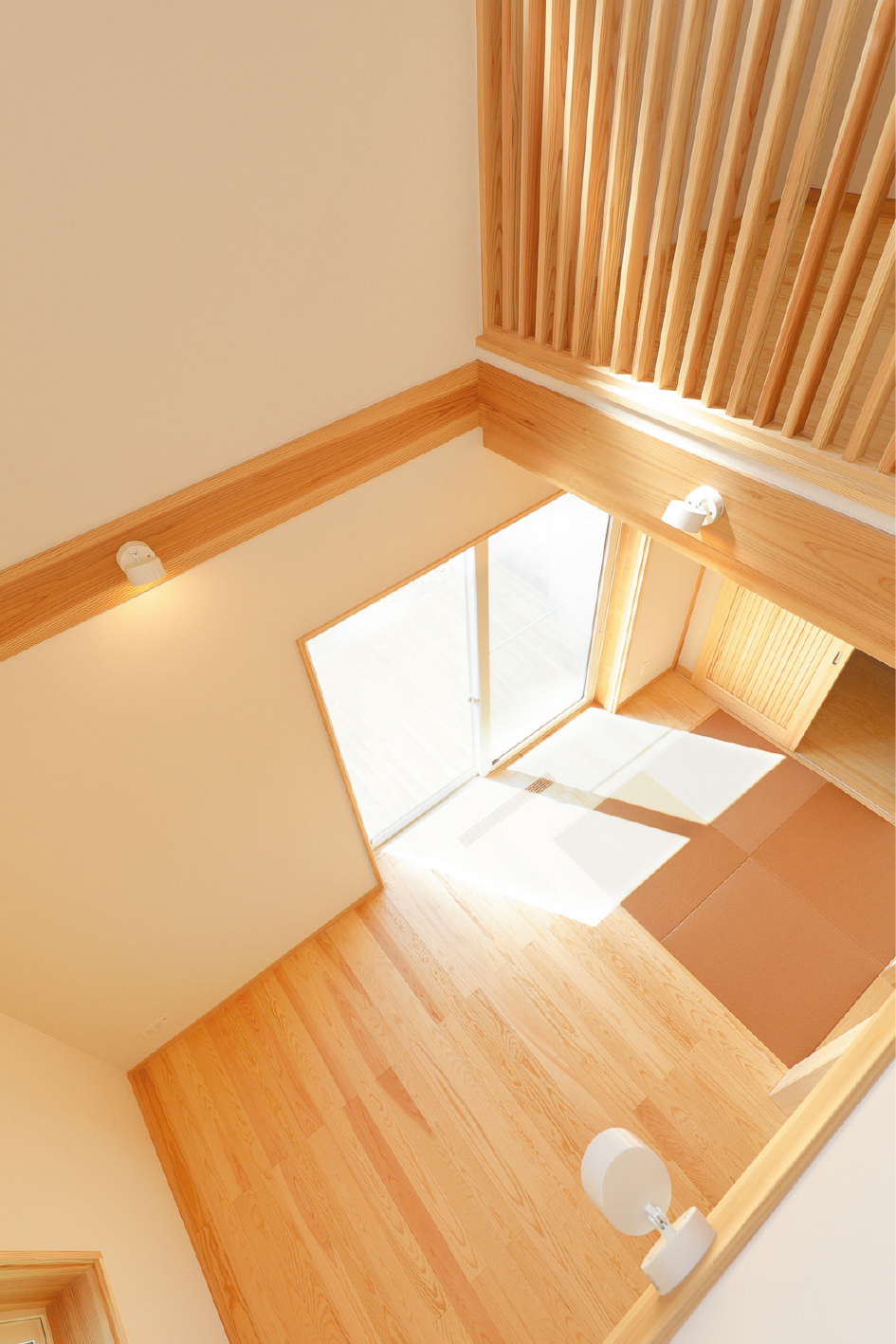 コンパクトながらも充実の間取りには、明るい吹き抜け空間も確保されています。外にはウッドデッキ、1階のリビングには風格のあるヒノキの大黒柱、畳コーナーやカウンターテーブルも用意。2階に設けた広いホールの一角には、仲良く鑑賞できるようにTVコンセントを設置。1・2階にはピクチャーレールを備え、子どもの作品を飾る楽しみが広がります。また、子育てで増えるものも片付く収納も十分確保されています。