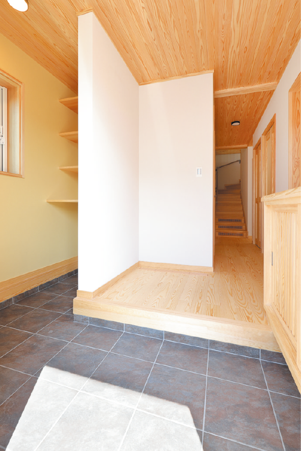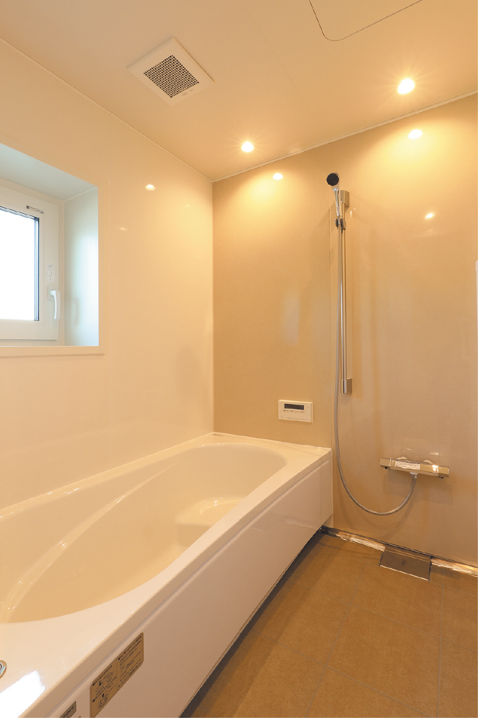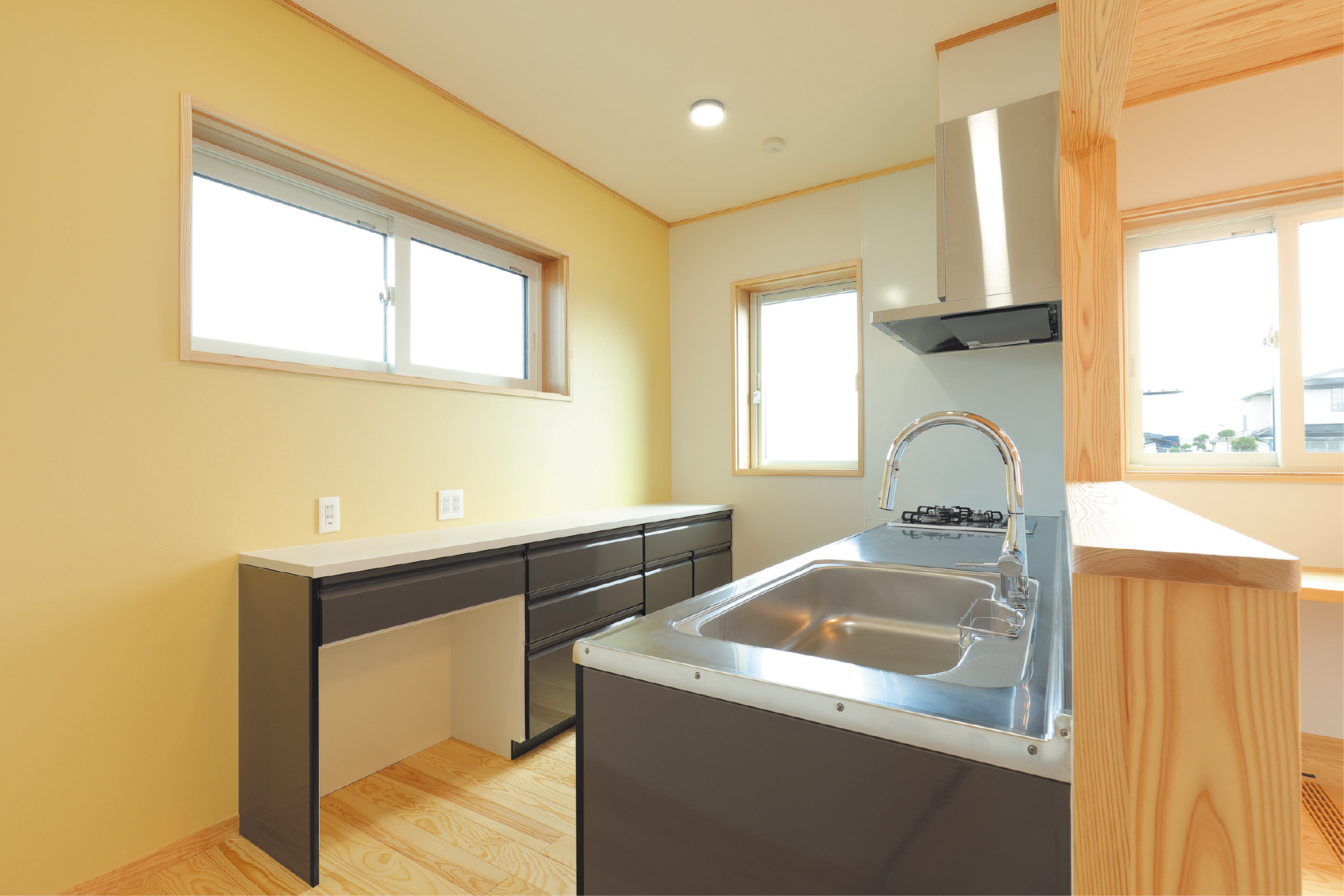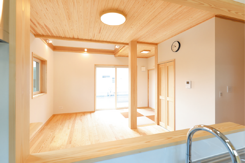 玄関を開けた瞬間から心地よい木の香りに包まれるオノダの家は、岩手県産のアカマツやスギなど無垢材を用いた内装はもちろん、建物の基礎や断熱・気密性能など完成すると見えない部分にもこだわりぬいているのが大きな特徴です。さらに、冬期は床下に設置された14帖用エアコン1台のみで全館暖房。家中どこに行っても足元からポカポカ暖かい。ダクトレスなのでメンテナンスもラクラク。壁断熱205mm厚、天井断熱360mm厚、さらにトリプルサッシを使用したこだわりの断熱性能。構造の確かさと、エアコン1台のみで全館暖房できる断熱性能、県産無垢材により調湿された快適な空気環境が家族の暮らしを健やかに支えます。
