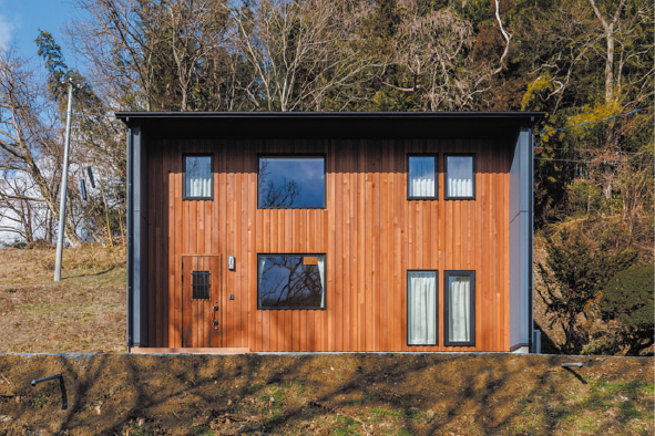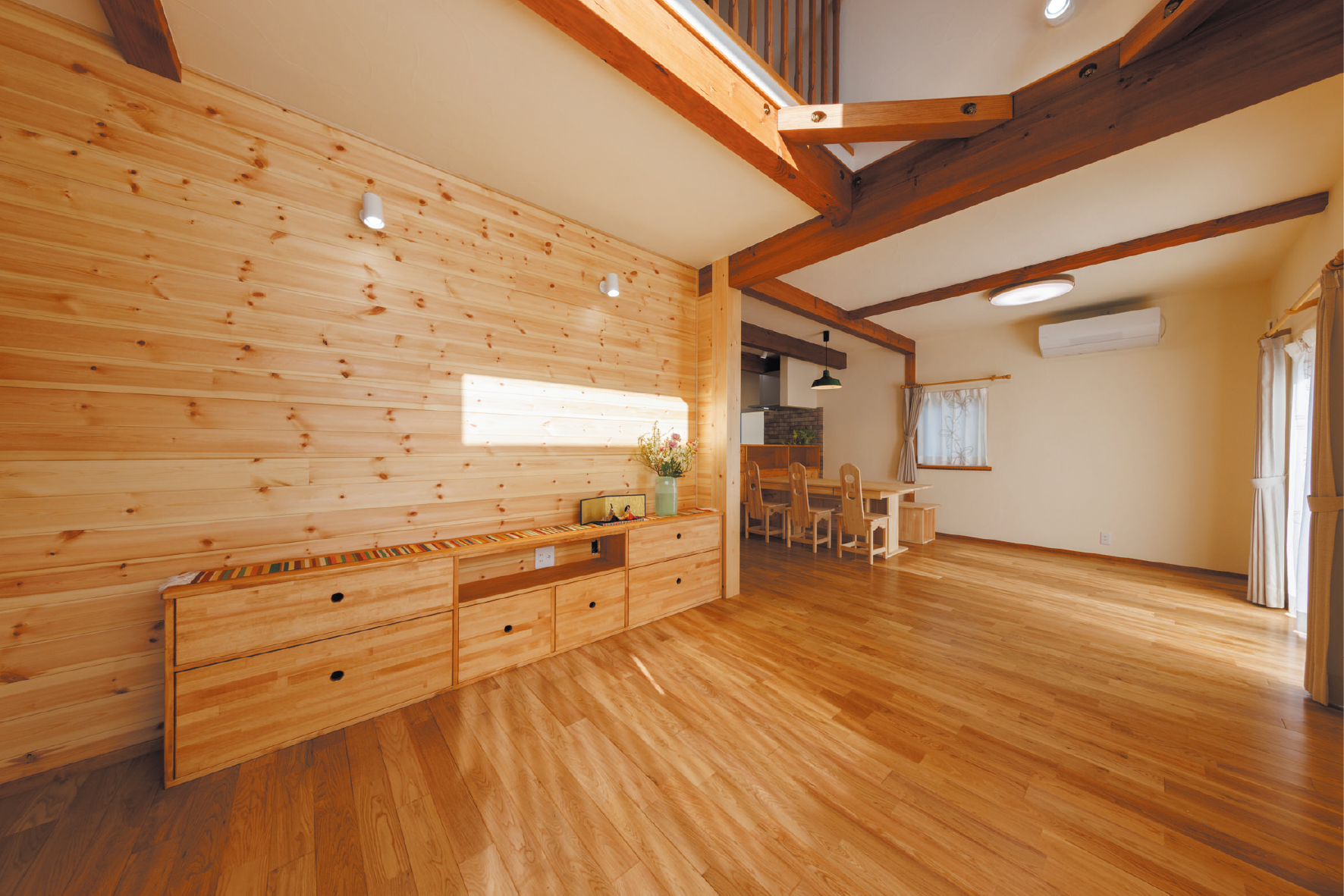 シャープな印象の片流れ屋根、ネイビーの外壁とコントラストをつけた杉板張りの外観、無垢材と塗り壁を施した室内は自然素材のやさしさが感じられ、真冬でもあたたかい家の中を子ども達は素足で駆け回ります。子育て世代のK様の要望を反映させ、吹抜けの明るいLDK、裏にパントリーと階段・水まわりなどプライベートスペースをまとめて配置し、家族みんなが使いやすい回遊できる動線にしました。吹抜けと回遊動線の効果で視線が広がり、コンパクトでありながらも開放感と家族とのつながりが感じられる間取りになっています。