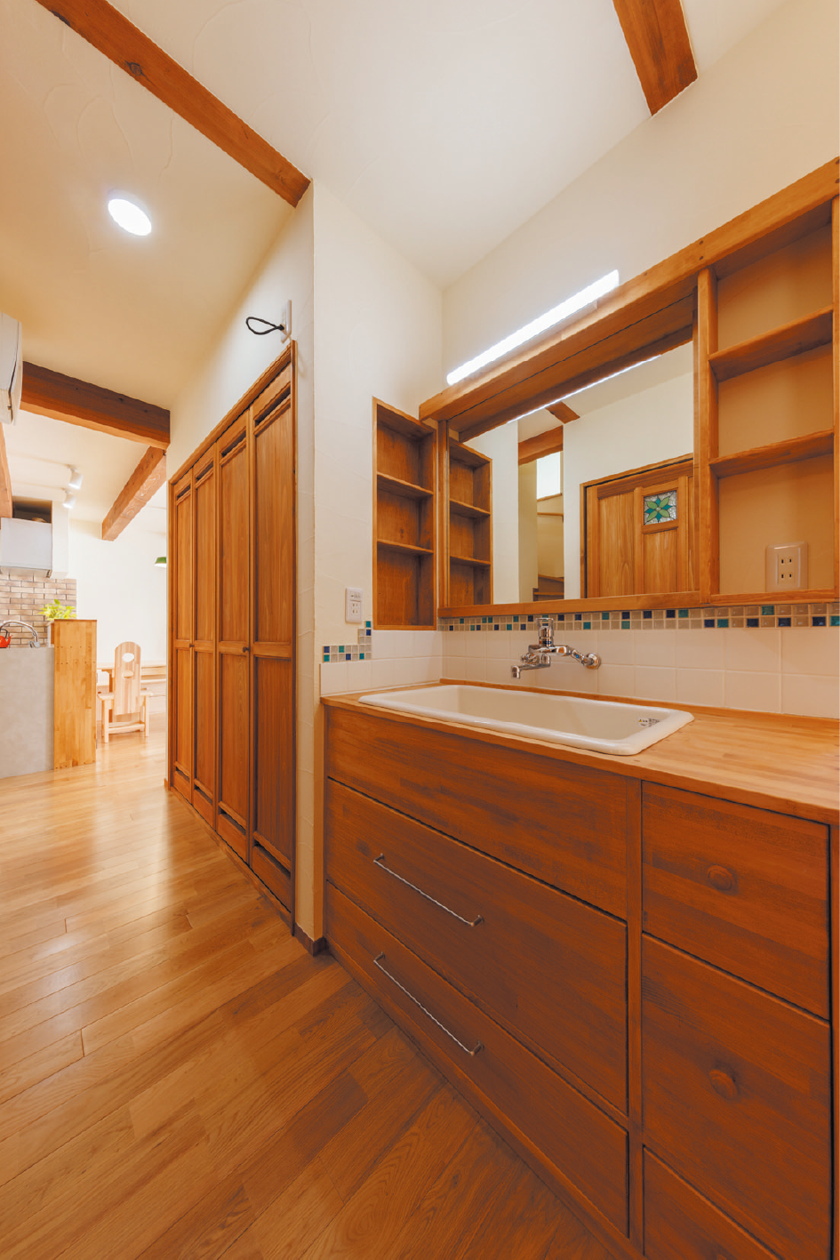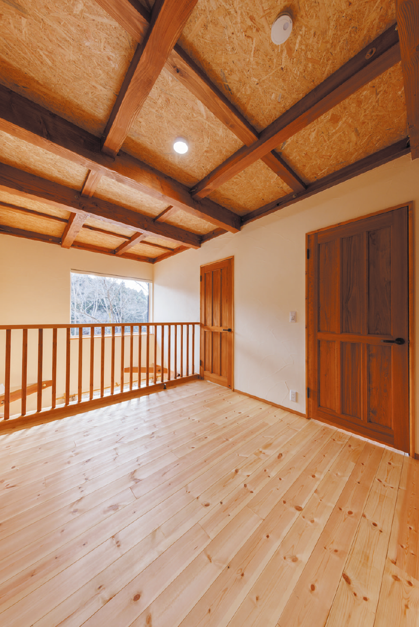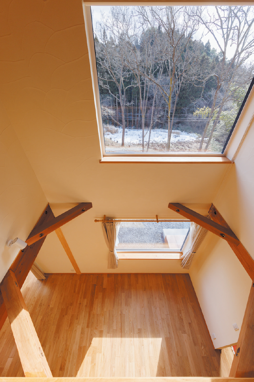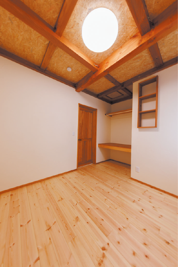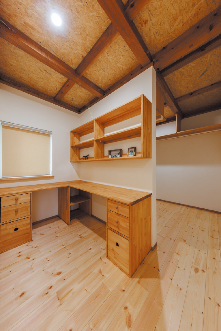 二階には洋室のほか、家族が自由に使えるWICとL字型のワークスペース、オリジナルの手造り家具を至るところに設置し収納力も確保しました。階段ホールから眺める一際大きなピクチャーウインドウからは、何かと忙しい日々の中、移り変わる季節の景色が愉しめます。