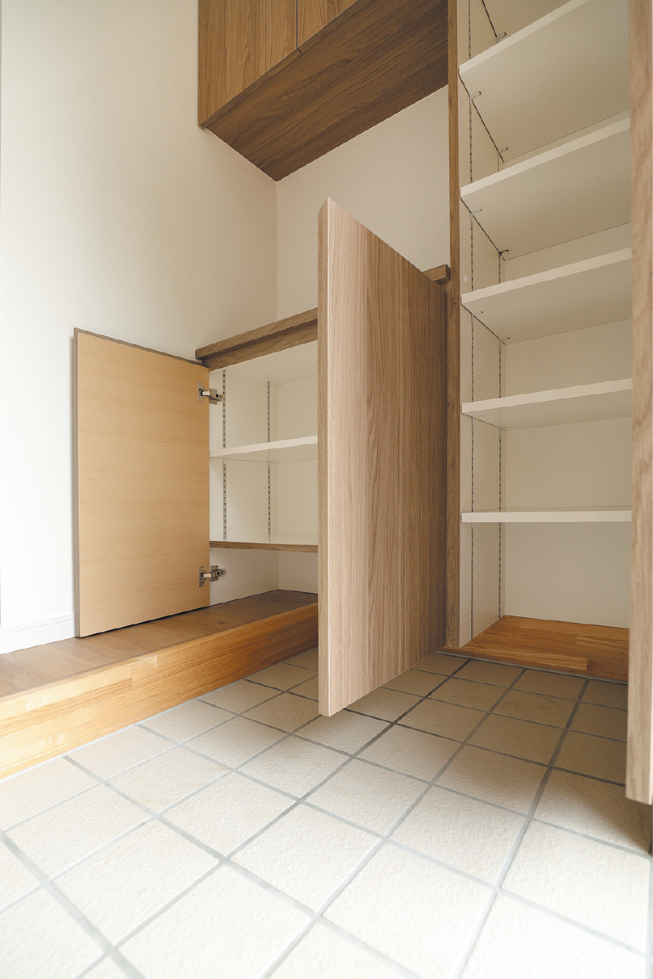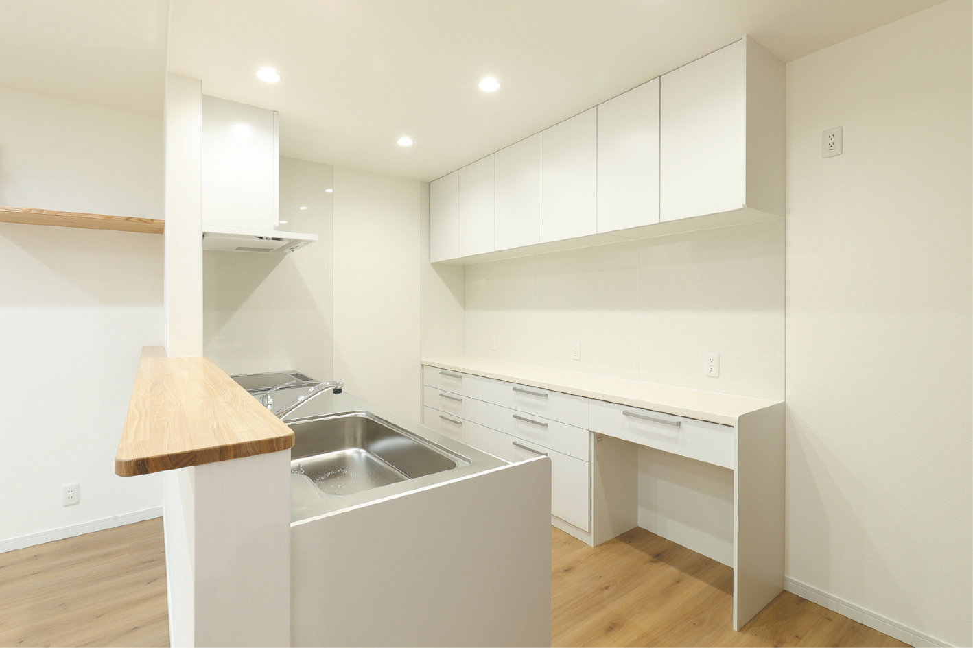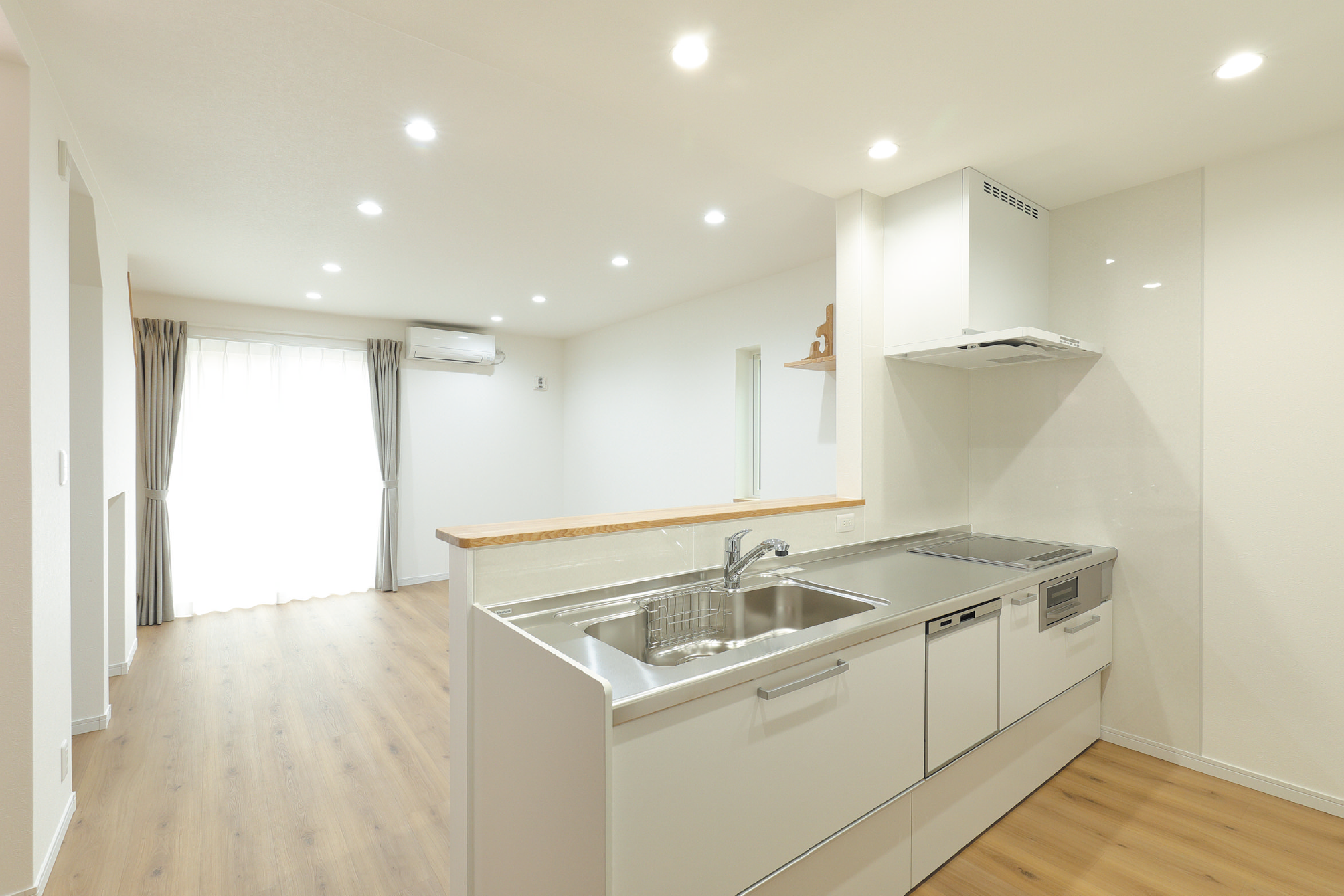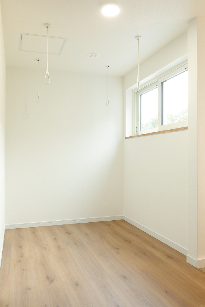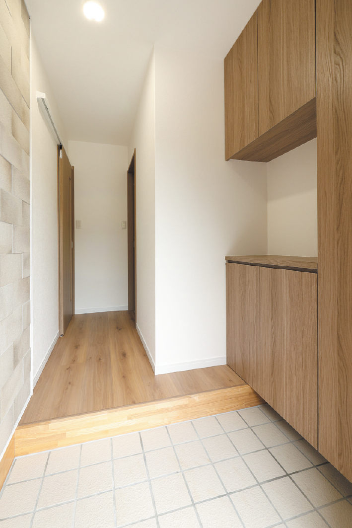 親御さんの住む家をリフォームするか、別な場所へ新築するかを迷った末に、将来を見据えて親御さんの家の近くに新築することを決定した今回。「住み心地の良い家にしたい」という施主様の思いと、同社の住宅に対する思いが合致し、理想を叶える家づくりがスタートしました。間取りからデザインまで何度も打ち合わせを重ね、完成したのは約25坪とコンパクトながらも充実した間取りの3LDKです。1階はパントリーを備えたLDK、水回りは脱衣所と洗面を分離した使い勝手の良い配置となっています。階段はリビングに設置することで、家族のコミュニケーションが自然と増えるよう配慮。2階には寝室や子ども部屋、室内干しにも便利なホールも完備されています。ライフスタイルを考慮し、床材には傷が付きにくいペルゴフロアを、玄関にはエコカラットを採用。シューズクロークや収納棚も造り付けするなど、細部までこだわって仕上げています。